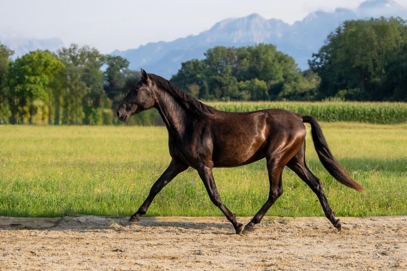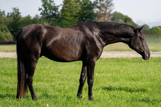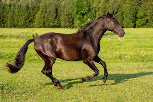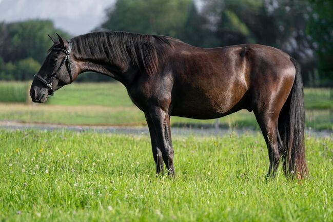 ...är en imponerande svart Pura Raza Española-valack som är välutvecklad för sin ålder. Han mäter för närvarande 1,63 meter. Han står i den eleganta, långbenta dressyrtypen med en bra grund och utmärkt överlinje och imponerar med sina enastående rörelser. Hans hopptalang var imponerande redan under hans yngre år.