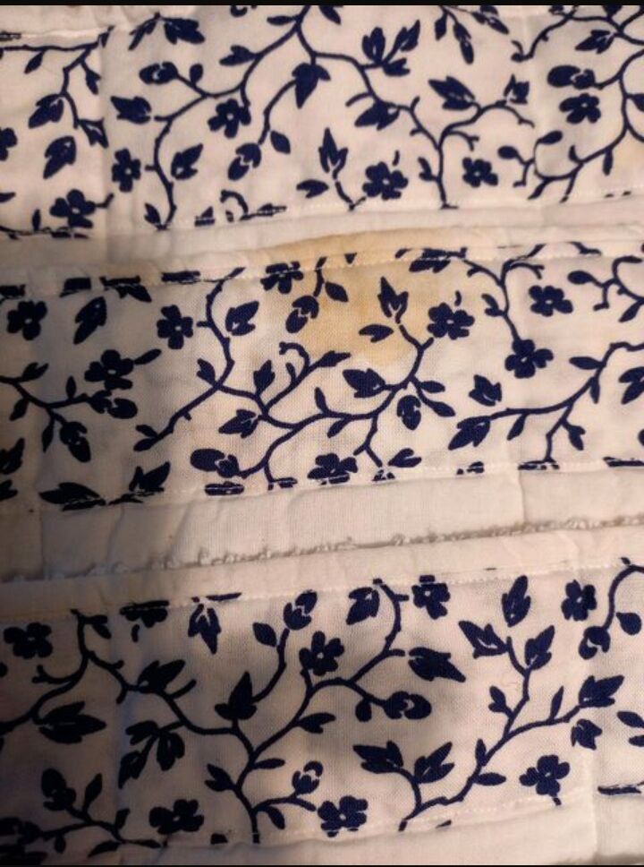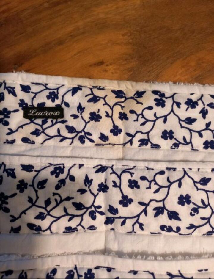 ⭐️Lacrox⭐️4er Uppsättning av bandageunderlag - Mycket snyggt set om 4 st bandageunderlägg av märket Lacrox i vitt med blommigt mönster i blått/marin. De är alla 4 lika stora: 38 cm höga, 43 cm breda. Insidan är tillverkad av absorberande frotté.