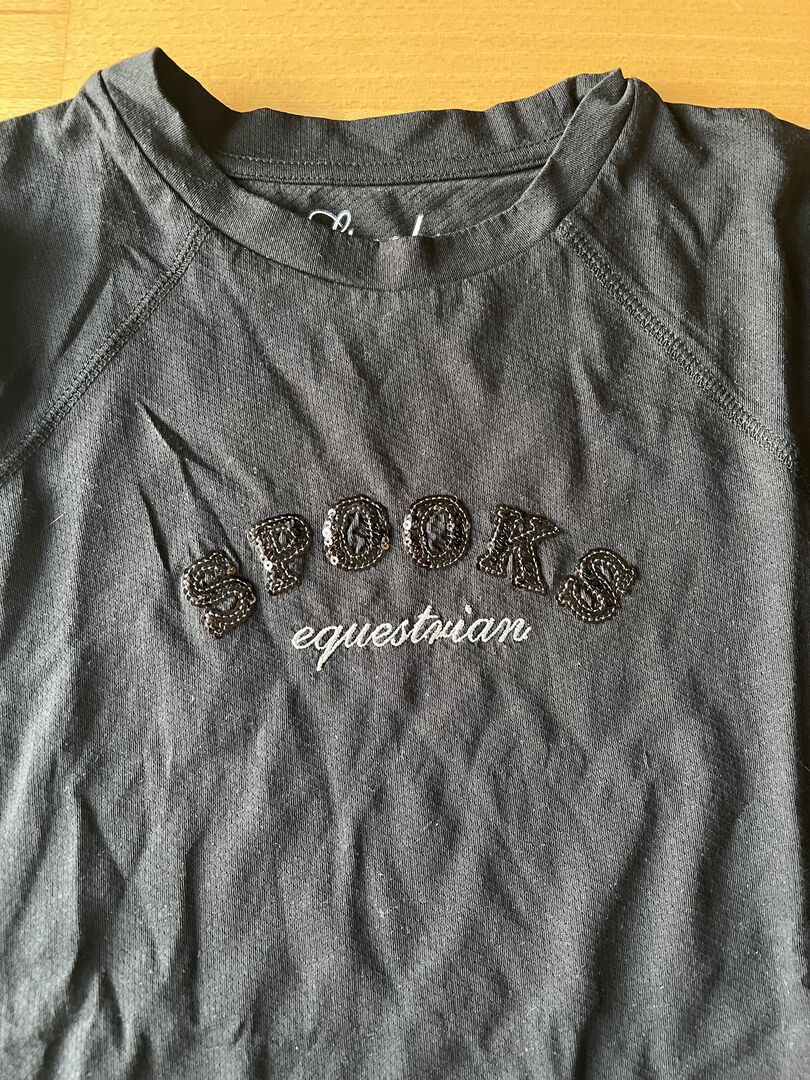 Jag säljer en ny Spooks långärmad tröja i svart med svarta glitterbokstäver och ärmar i lätt mesh. Perfekt för sommartemperaturer eller under en tävlingsjacka. Tröjan är helt ny och har aldrig använts. Då Spooks har lagt ner produktionen kommer denna tröja inte längre att produceras.