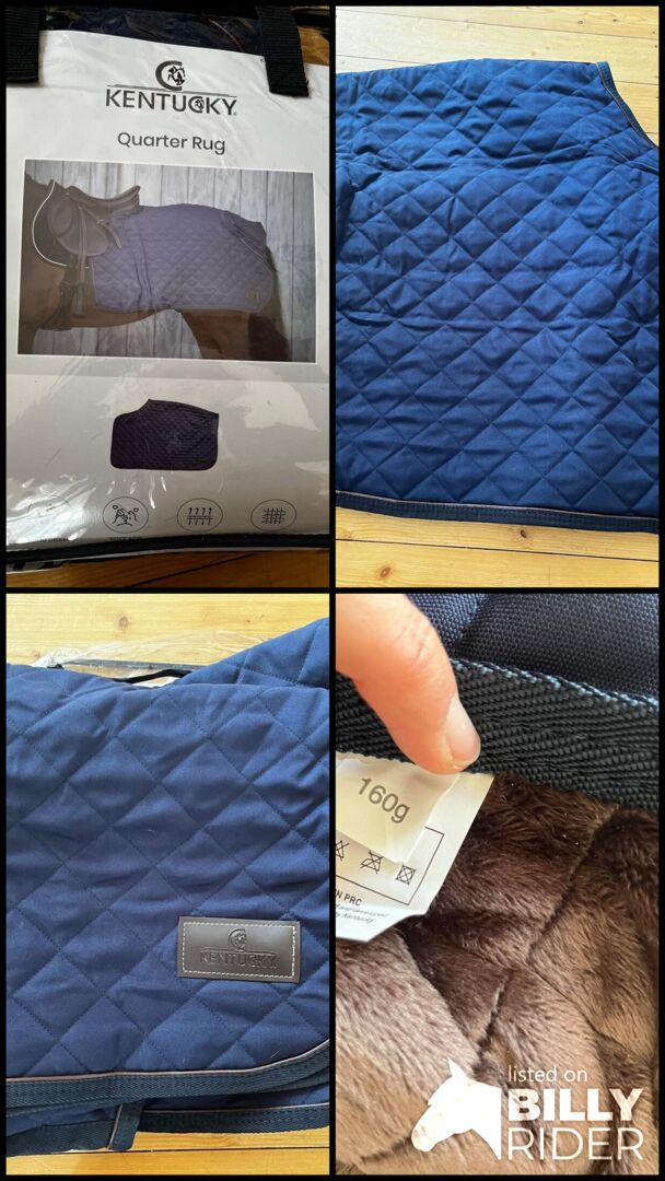 *NYHET* Kentucky Horsewear Quarter Rug Medium 160g - Marin - Jag erbjuder en Kentucky Horsewear Quarter Rug i storlek Medium (160g fyllning) i Navy. Skick: Så gott som nytt, endast lagt på hästen för tillpassning - inga tecken på slitage, inga fläckar. Egenskaper: Robust yttertyg, mjukt foder av konstgjord kaninpäls, kardborreknäppning på sadeln, krubbitar. Skötsel: Tvättas i maskin vid 30°C (ej i torktumlare). Djurvänlig: Ingen äkta päls används!