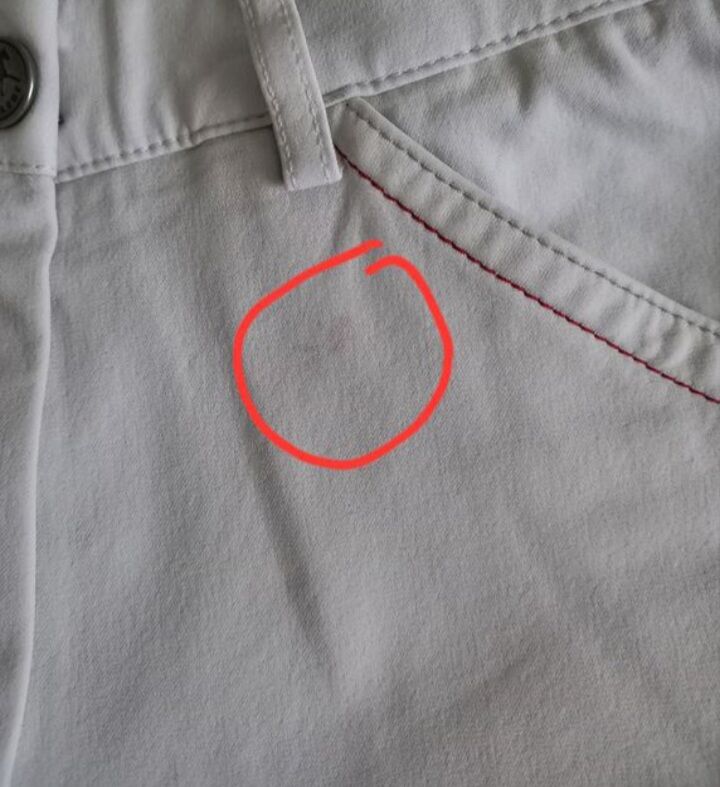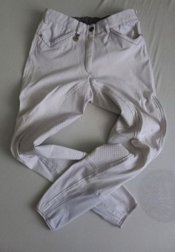 ⭐️Pikeur⭐️Turnierreithose Patricia Fullgrip i storlek D36 - Välbevarade Pikeur tävlingsbyxor, modell Patricia Fullgrip, i storlek D36. Passar även barn med storlek 176. Färg: vit, röda dekorsömmar. Greppet är oklanderligt. Där det finns flisor finns det spån: byxorna har lätt missfärgning på sätet och benen från sadelläderet. Det fanns också ett litet hål på niten i vänster bakficka (foto), som syddes upp. Det finns en liten, blek, knappt synlig fläck strax under linningen på vänster sida (foto). NP var 140 €.