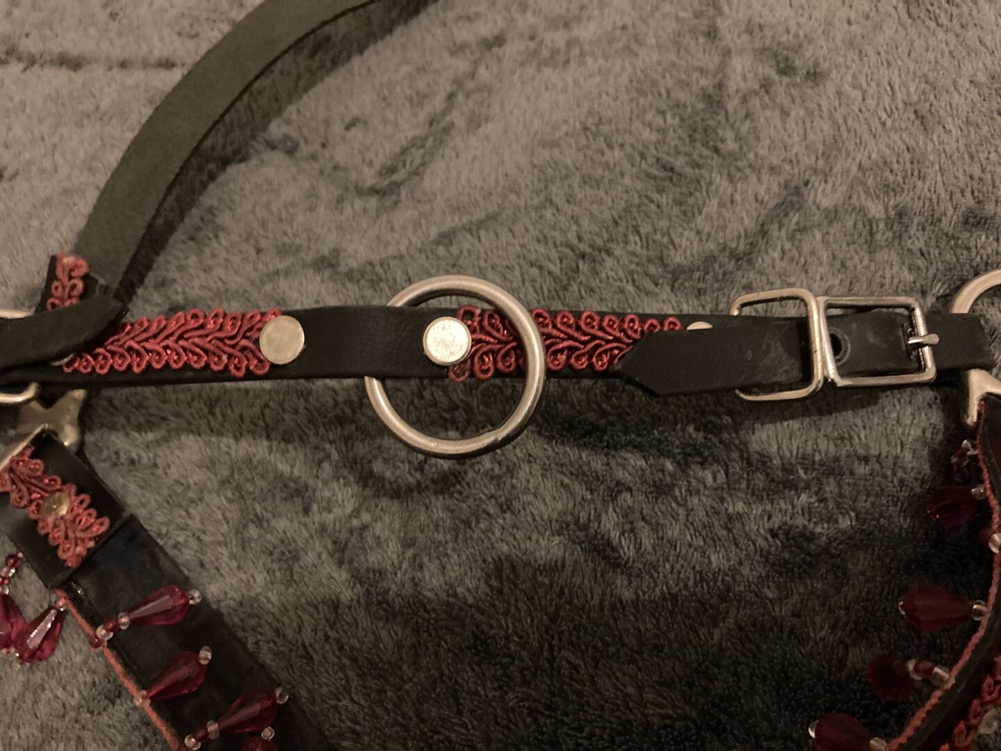 Några pärlor och paljetter har fallit av... men det är inte bortglömt, eftersom hästarna får röra sig med det :-). Som du kan se på bilderna av halterneckan är de röda sömmarna lite frissiga. Det syns dock inte på bilderna.