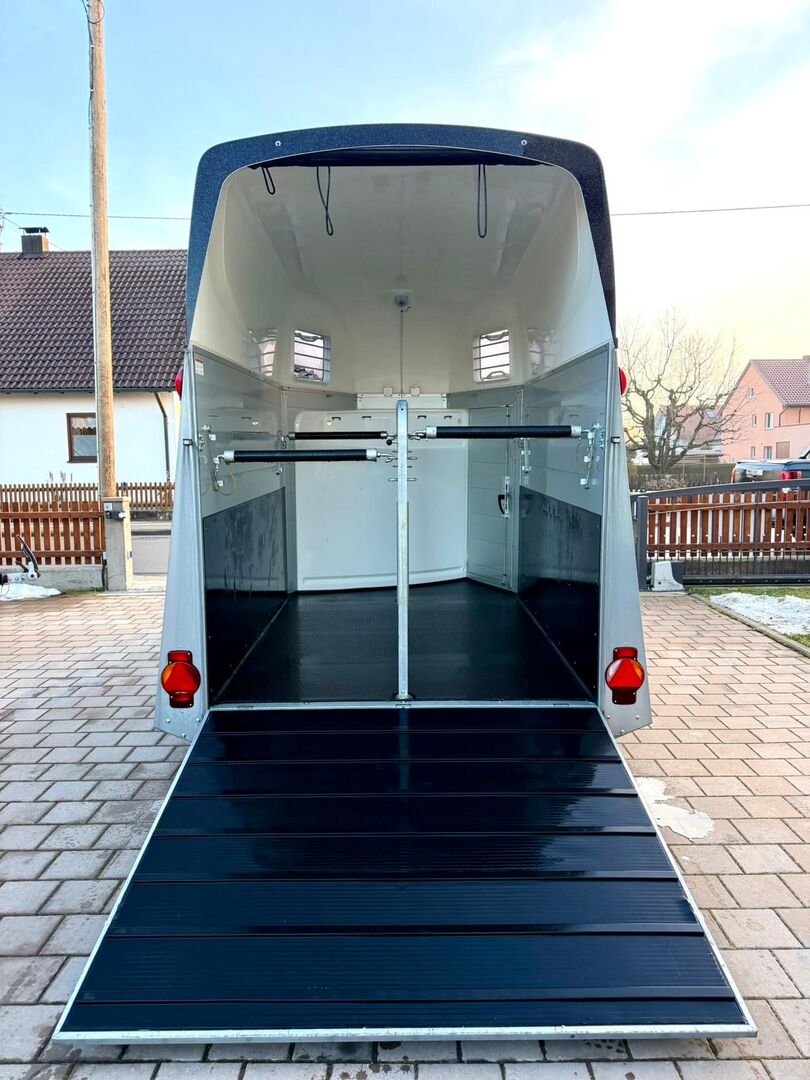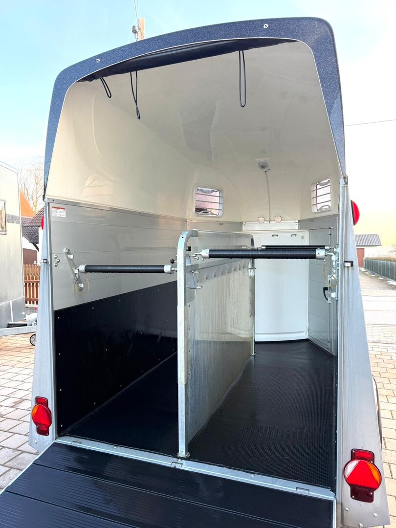 - Första registrering 07/2023 - Vikt utan last ca 887 kg - Tillåten totalvikt 2000 kg - Max. dragstångsbelastning 100 kg - HU fram till augusti 2027 - EquiDrive-chassi med stötdämpare för 100 km/h-godkännande - Automatiskt jockeyhjul - Öppningsbara tonade fönster - Paniksystem - Lastningshjälp - Rullgardin i nät - Låsbar sadelkammare - AluBiComp-golv - Gummigolv limmat och tätat - Hållare för hönät - Invändig belysning - Hållare för foder- och vattenhinkar - Skydd för trappsteg - Skiljevägg av PVC, helt flyttbar och justerbar med svängbar stång - Nivellering av ponny fram och bak