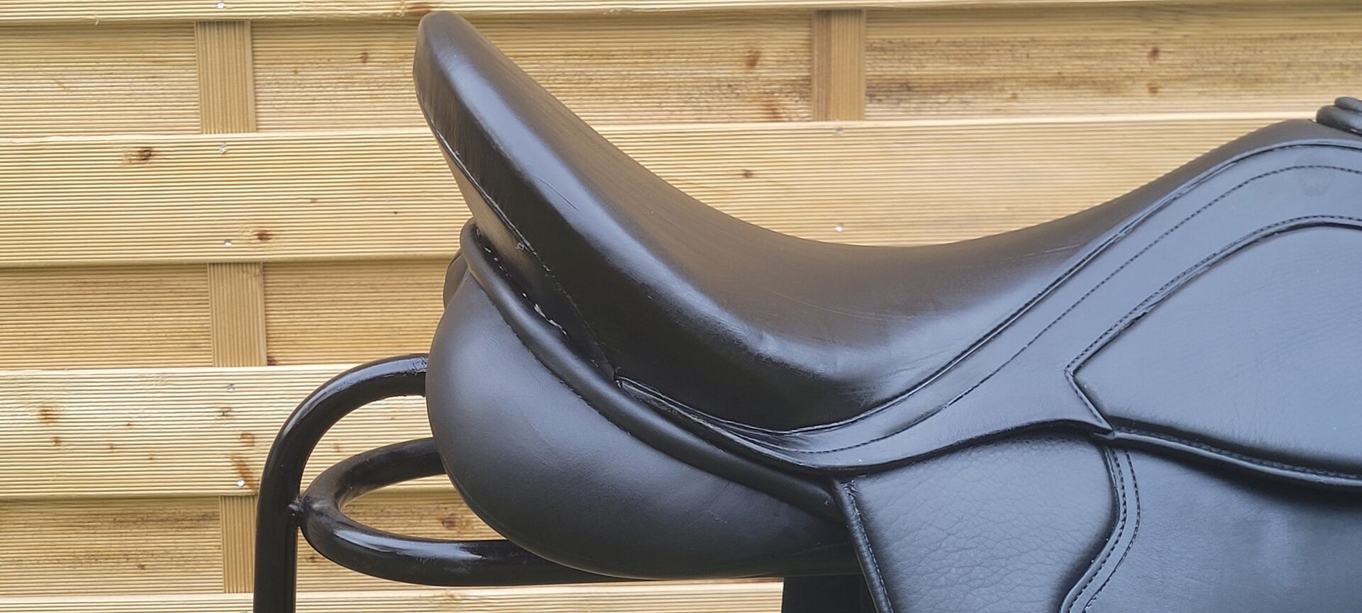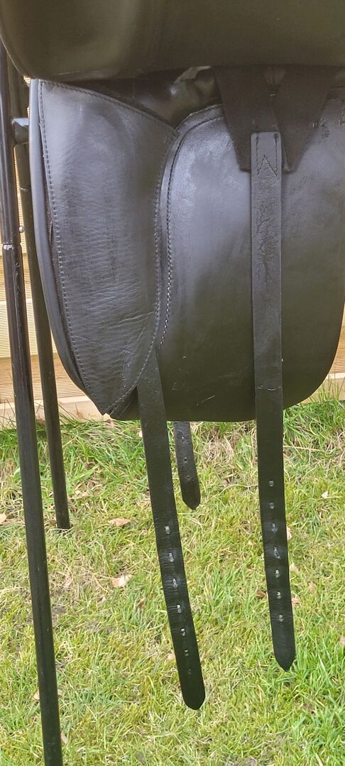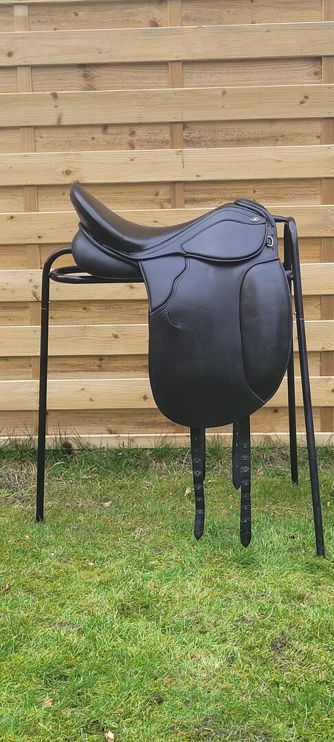 ***TOP*** Jorge Canaves JC dressyrsadel 17,5 tum 32 KW svart - Används endast för inskolning. Jag har suttit i sadeln 6 gånger i 20 minuter varje gång och den passar inte längre. Jag har inte provat kardborreknäppningsfunktionen ännu; den har fortfarande originalläderskyddet från fabriken. Den är en riktig blickfångare för priset (NP var 2.295€ !) och man sitter i den mjuk som smör. Den passar även hästar med hög svank på grund av den snyggt skurna och försänkta kammaren. Mjuka paneler och den mycket breda ryggradskanalen avrundar det hästvänliga snittet. Lädret är nu också smörmjukt och har naturligtvis alltid vårdats ordentligt!? Det är bara att komma runt och bli förälskad :) Du får verkligen en nästan ny sadel för priset.