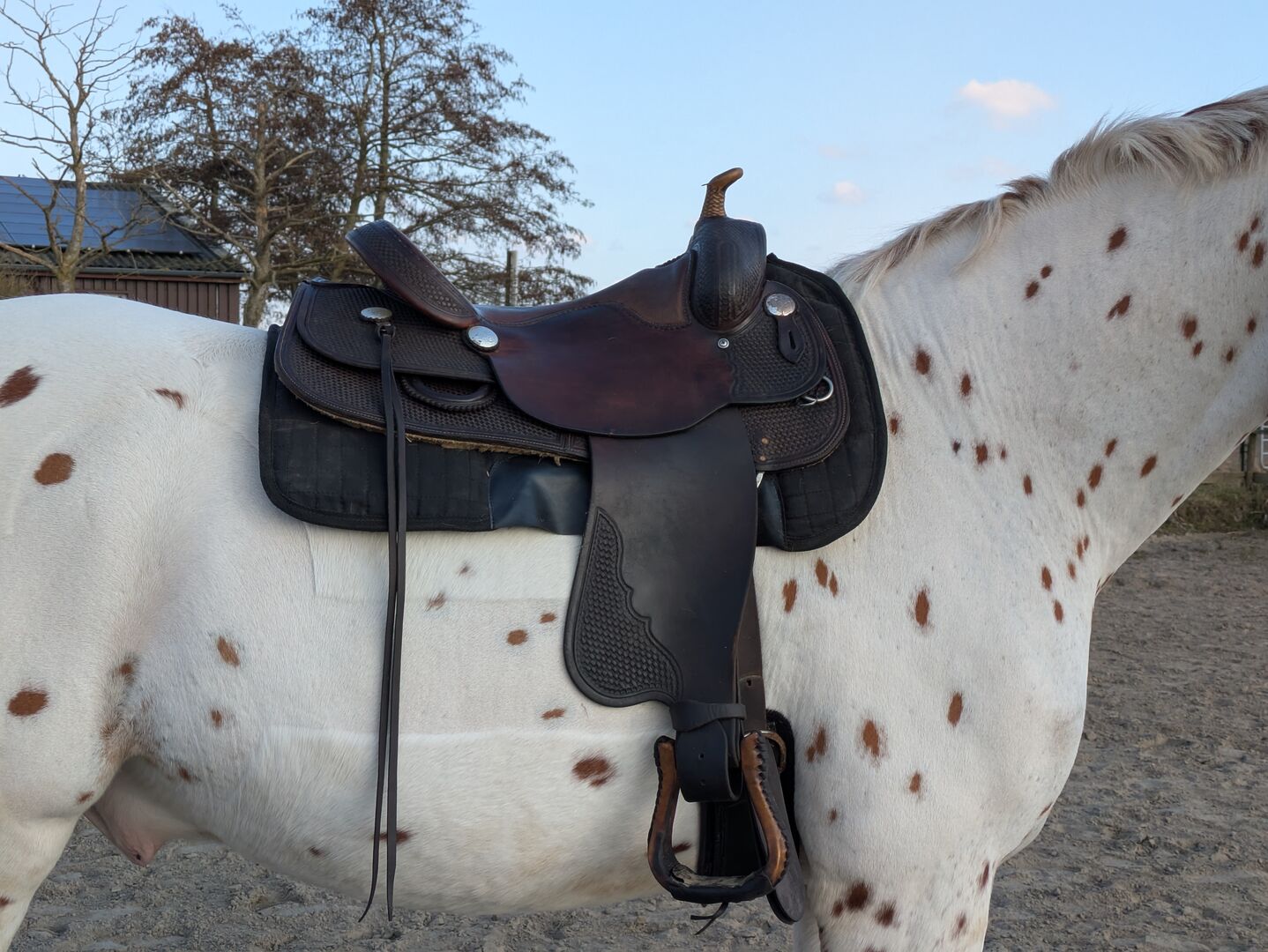 Sadeln tillhörde mitt gamla Haflinger-sto, som tyvärr har gått bort. Hon var kraftig och bred och hade lite sväng i sin bakdel. Tyvärr passar den inte min Knabstrupper-valack, så det är med tungt hjärta jag måste skiljas från den. När det gäller svänget passar han dock också bra där tack vare sin större manke och något stigande överlinje. Tecken på användning är naturligtvis närvarande