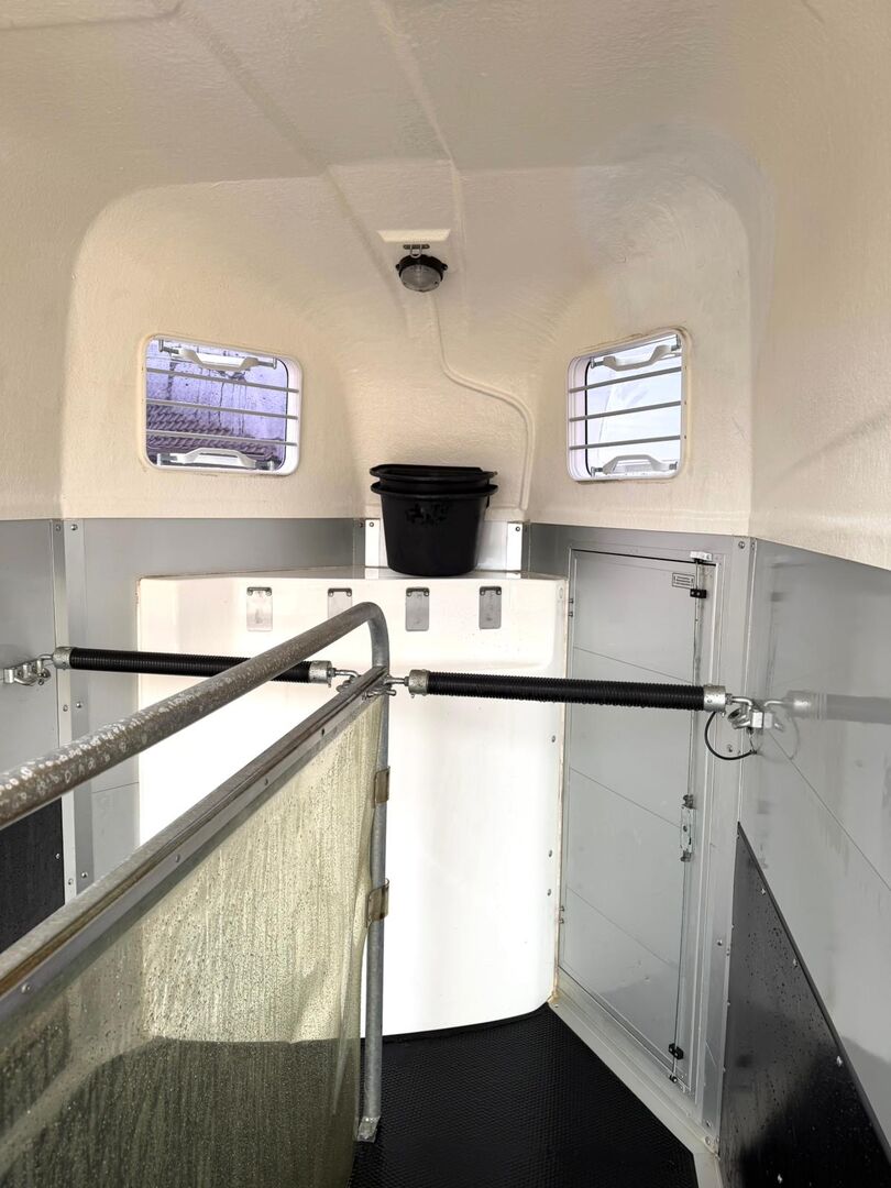 ❗️Wörmann Pikaro Alu Saka hästsläp Hästsläp - - Första registrering 07/2019 - Vikt utan last 710 kg - Tillåten totalvikt 2000 kg - Max. dragstångsbelastning 100 kg - HU fram till september 2027 - Chassi med stötdämpare för godkännande för 100 km/h - 2 däck från 2023 - 2 däck från 2025 - 100 km/h registrerad - Automatiskt jockeyhjul - Öppningsbara tonade fönster - Paniksystem - Presenningslyft - Lastningshjälp - Låsbar sadelkammare - Lås för släpvagn - Invändig belysning - Hållare för hönät - Hållare för foder- och vattenhinkar - Skopa - Golv i aluminium - Golv av gummi - Skiljevägg av PVC, helt flyttbar med justerbar svängbar stång - Skydd för trappsteg