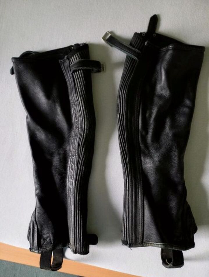 ⭐️Zeitler/svart läderkläder Sticher L⭐️ - Toppskick svart läderchapes av Zeitler, modell Stitcher, i tillverkarens storlek L. Osträckt omkrets vid den bredaste delen av vaden ca 34 cm, se foto. Chapsen är ca 44 cm långa på utsidan i höjdled, på insidan mäter jag ca 41 cm. Dragkedjorna fungerar perfekt!