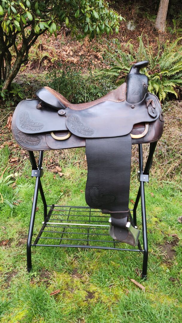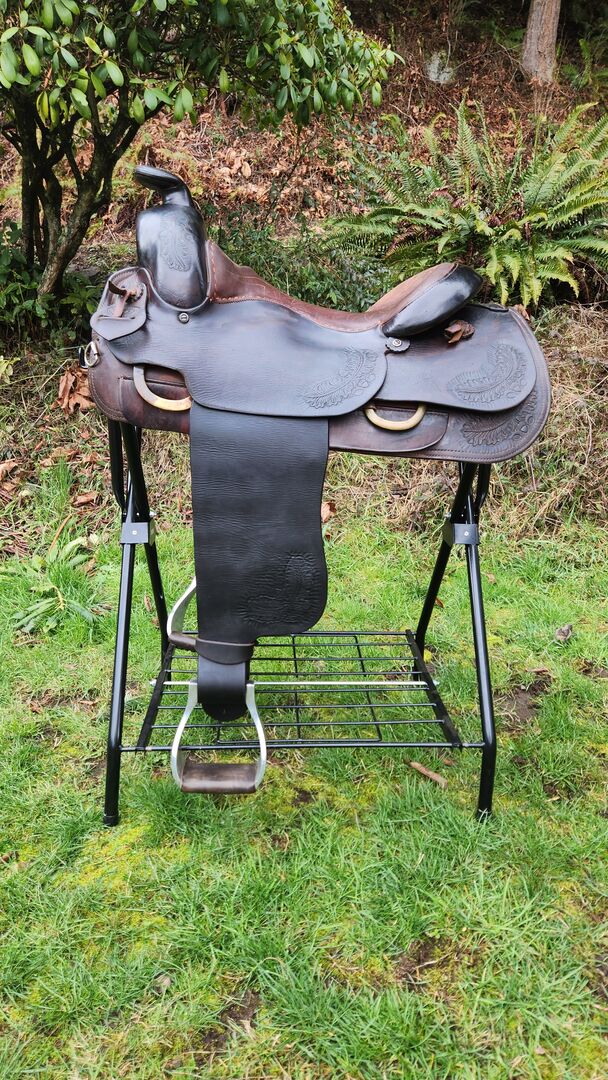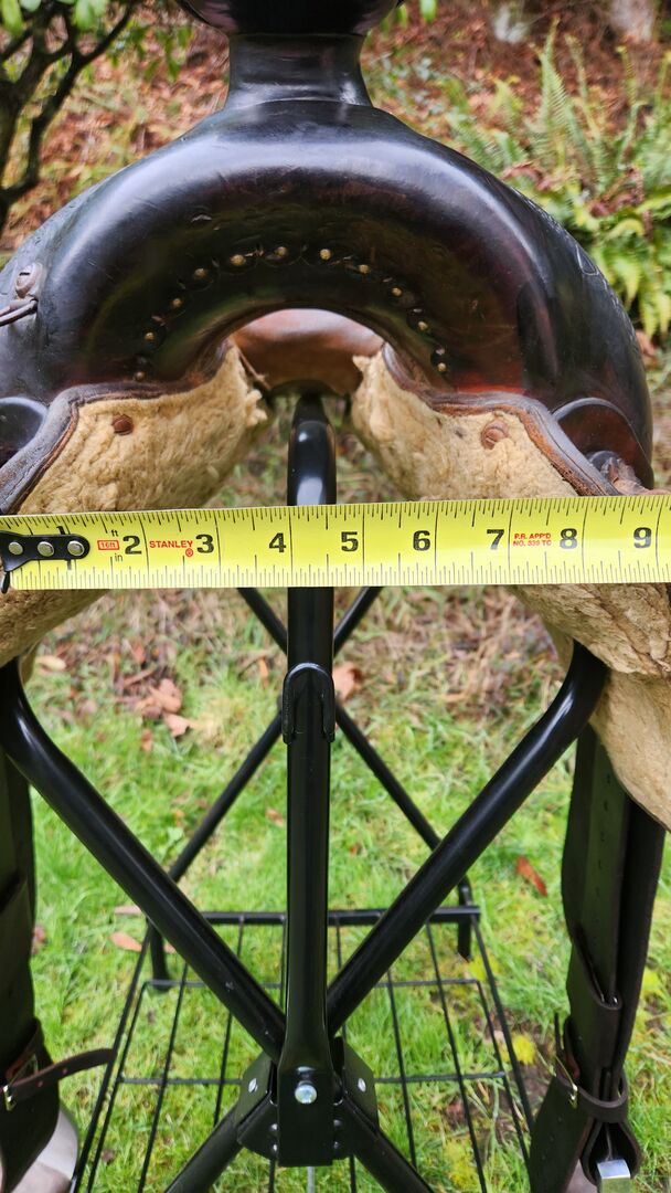 Measures 15" to the padding, brand new custom made fenders, and stirrups shown in photos. Comes as shown. Very well made saddle and extremely comfortable, just doesn't fit me