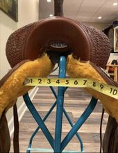 Schicker 17” Westernsattel mit hochwertiger Verarbeitung und klassischem Design. Das schöne braune Leder ist mit detailreicher Basket- und Floralpunzierung versehen und wird durch silberne Conchos stilvoll ergänzt – ein echter Hingucker!