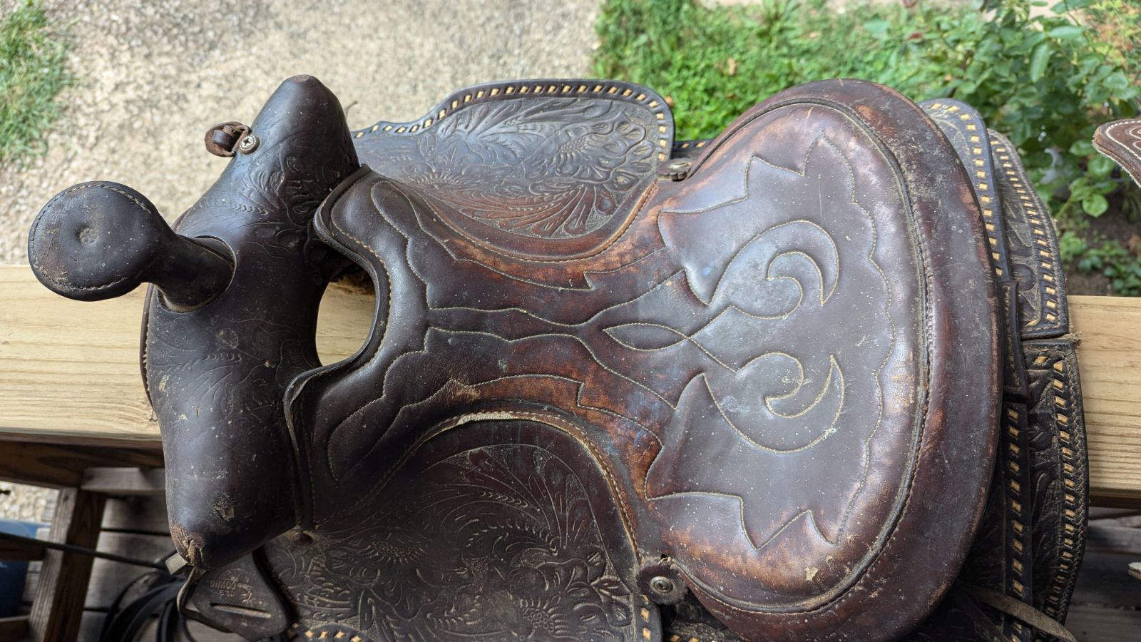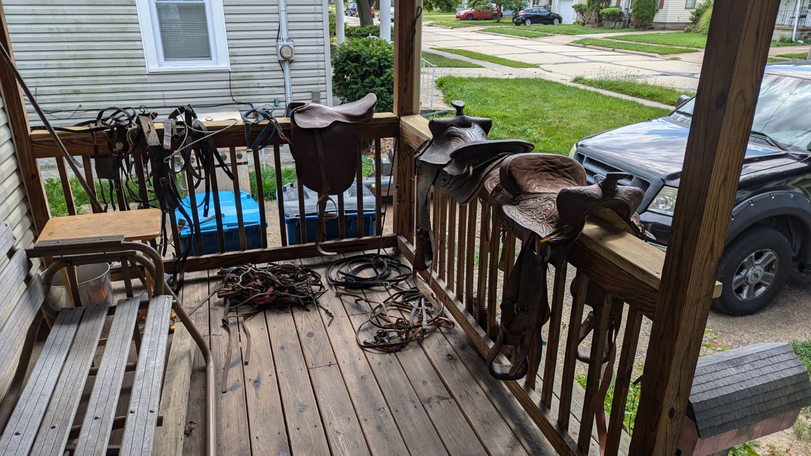 Old multiple leather saddles, grits, riding equipment. All needs to go.