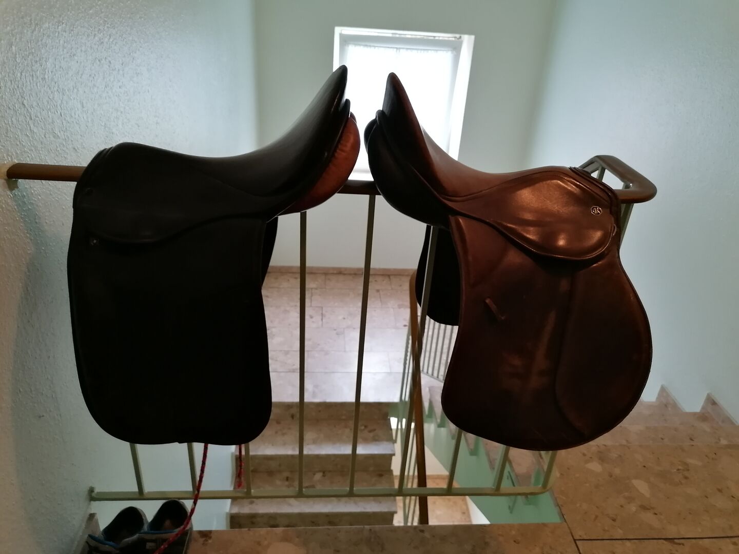 2 sadlar till salu - Att ge bort från dödsboet : 1) Stübben dressyrsadel, 17 tum, välskött, begagnad med vanliga tecken på användning. Klädseln är fortfarande mycket bra, fjädrarna rör sig lätt, lädret är väl omhändertaget. 2) VS-sadel från Kiefer, även den 17 tum, äldre modell, men mycket välskött, brett skuret för en häst med mycket svank. Båda sadlarna var på ett smalt varmblod, i seniora händer. På begäran även med sadelduk/sadelunderlag. Frakt via DHL-paket är möjlig. Pris VB 400 per sadel