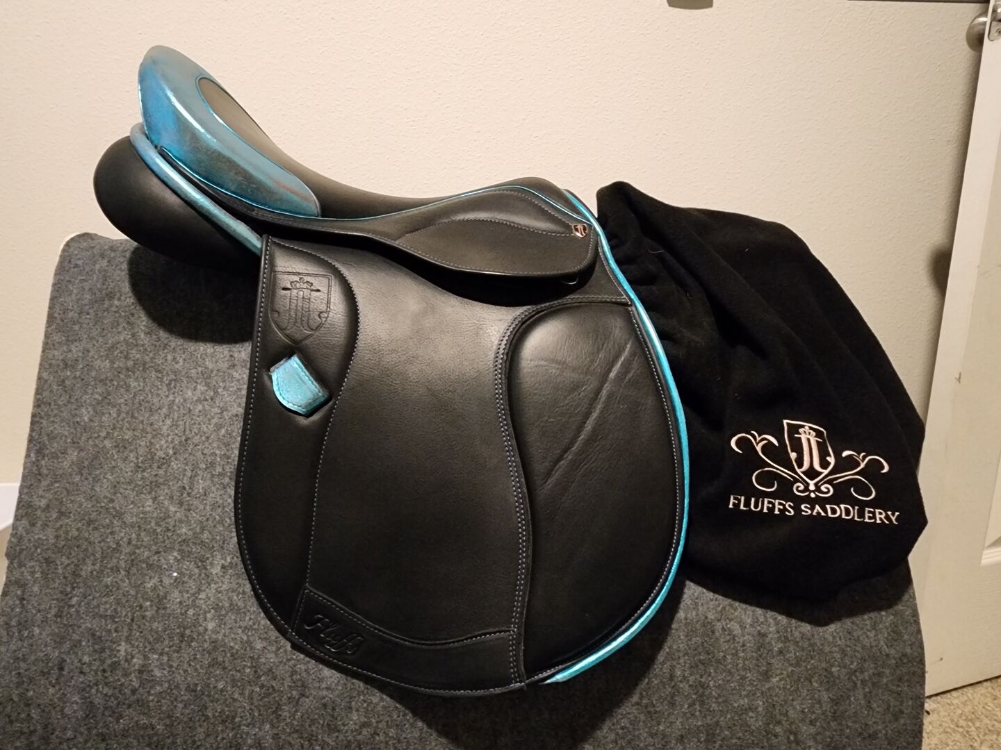 Black calfskin leather Metallic teal piping, stitching, keepers, seat top ad edging Flexible Tree Extra comfortable memory foam seat (18" seat) Dual flap U Headplate Adjustable gullet system Intelligent double wool flocked panels (great for short backed horses) Safety stirrup bar Shoulder relief panels Interior velcro knee and interior knee blocks Short girth straps