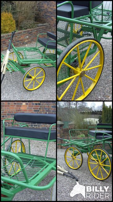 4 Wheel vehicle dual purpose, single horse or pony pairs. With back-step, groom seat, roller bearing turn table, disc brakes, extending axles 125 and 138, with sprung pole and set of shafts for single use. Superide suspension.