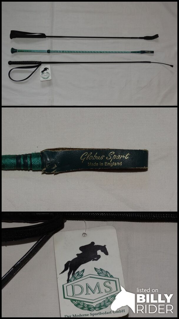 Nederst: ny kort piska från DMS med handrem, svart, 67,5 cm, utan stötdämpare = 10 €.
