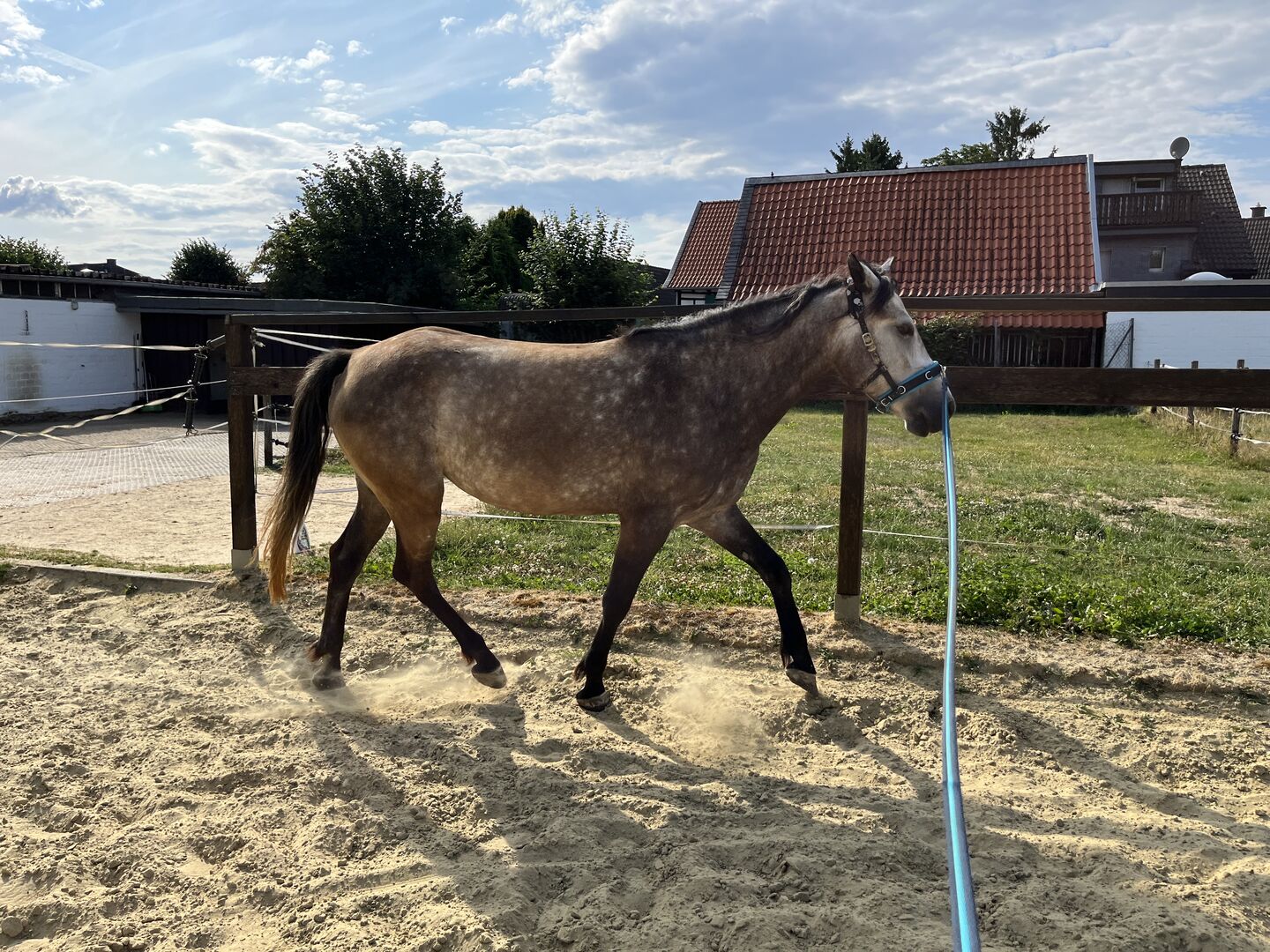 Sky är 5 år gammal och registrerad som en holländsk ridponny. Hon såldes till oss som en Connemara mix, men jag kan inte säga vilka raser hennes föräldrar egentligen har. Hon är en grå dun.