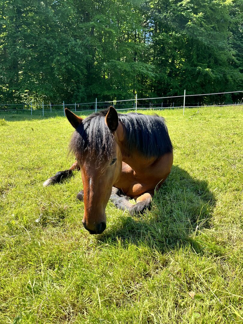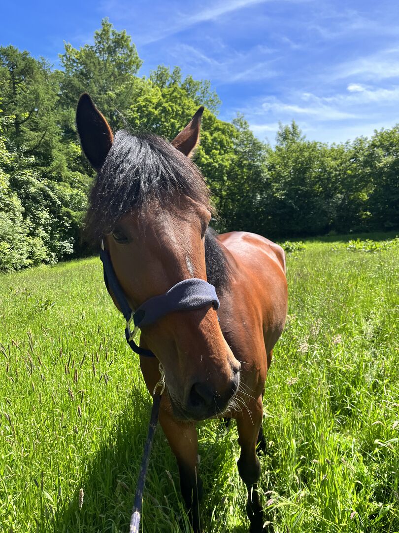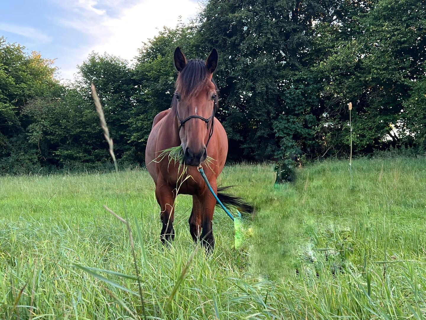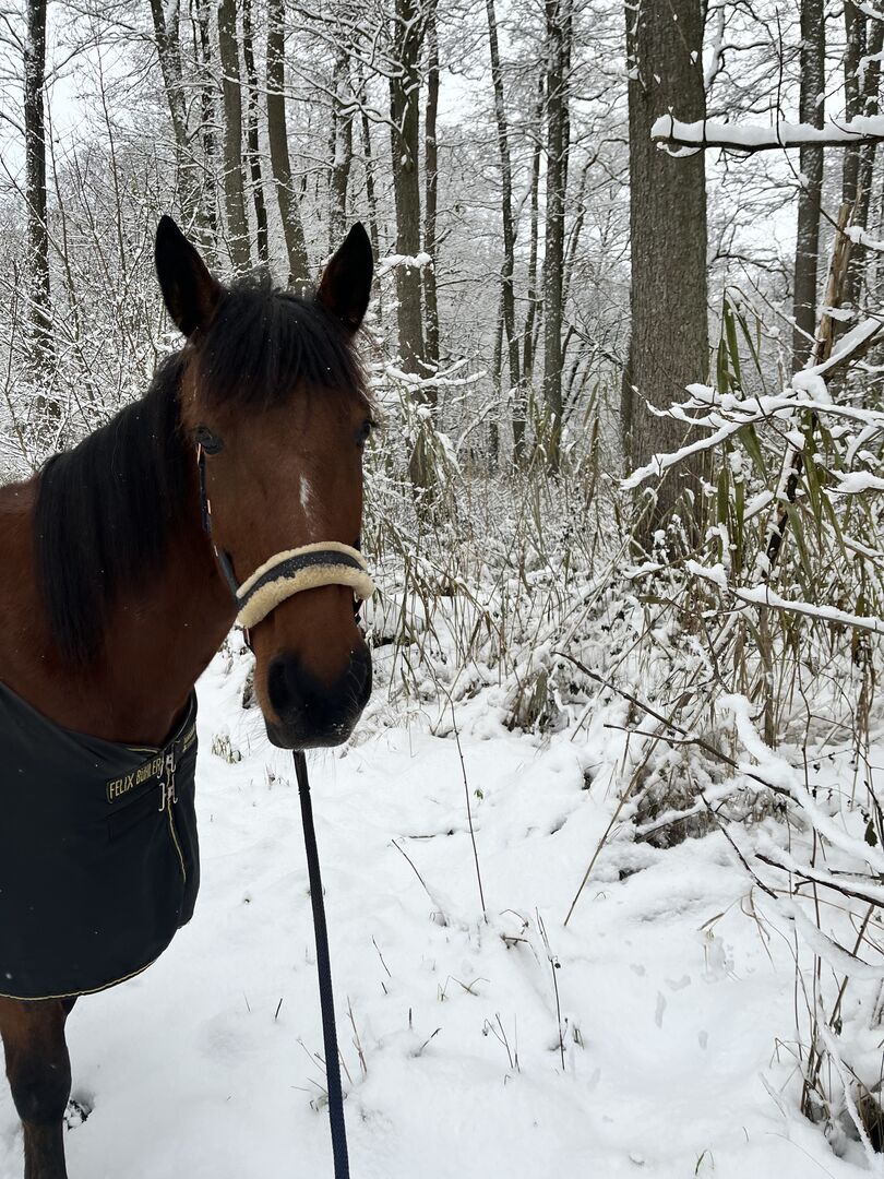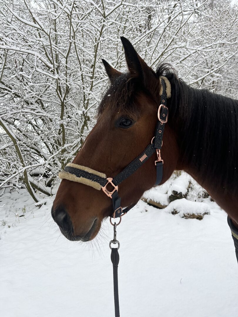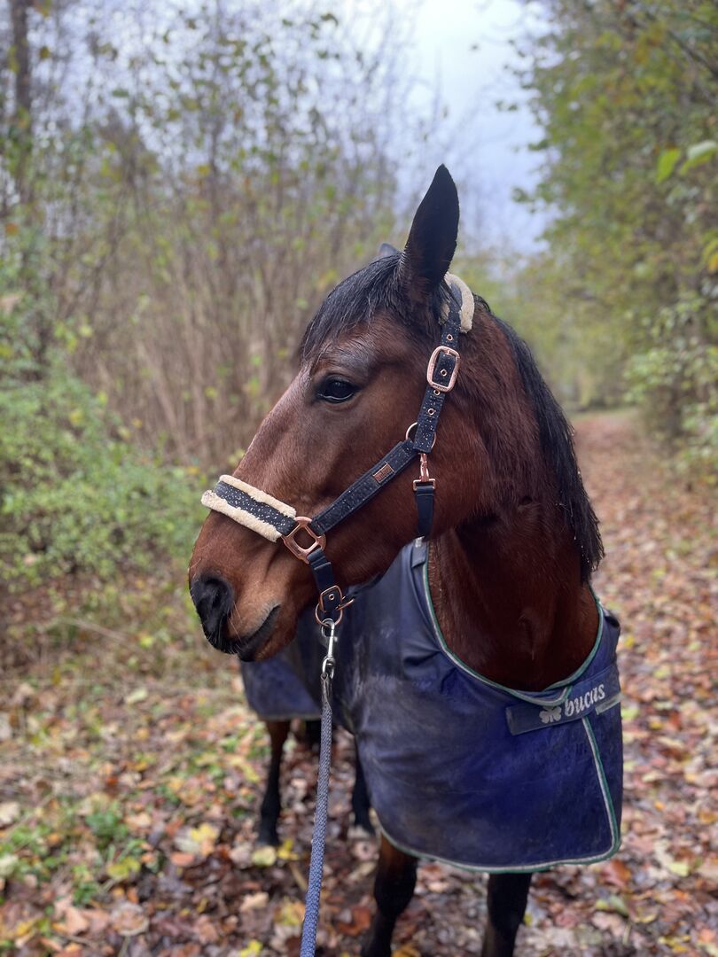 Lotte är en känslig, ärlig, mycket uppmärksam och villig att lära sig häst. Hon lär sig mycket snabbt och har mycket roligt när hon gör det. Jag köpte henne som en ridhäst, men eftersom hon kom till mig alldeles för mager och muskulärt helt spänd och dessutom halt, byggde jag först upp henne igen. Under tiden har hon nått sin normalvikt och genom osteopatisk behandling har hennes muskler återhämtat sig och byggts upp. Hon har fortfarande problem med ett översträckt knäledband från tid till annan, men detta kan stärkas med ytterligare träning och förstärkning av muskulaturen och påverkar henne inte längre (röntgenbilder av rygg, fotsida, hock och knä har tagits och befunnits vara normala). De kan ses i Bargteheide). Under de senaste månaderna har vi endast arbetat från marken (stångarbete, dubbel lunga, lunga, sidovägar och cirkelarbete ->komplement) och har gått mycket på promenader. Ibland är hon lite nervös, men hon är alltid lätt att hantera och rymmer inte. Jag har också suttit på henne några gånger, vilket hon gör utan problem.