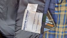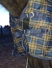 600D eQuiTack regncape med hög hals 135 145 155 blå rutig med polar fleece 3000mm - Restlager av regnfiltar från nedläggning av eQuitack GB, försäljning med rabatt, istället för 98,50€ styck 50,00€.