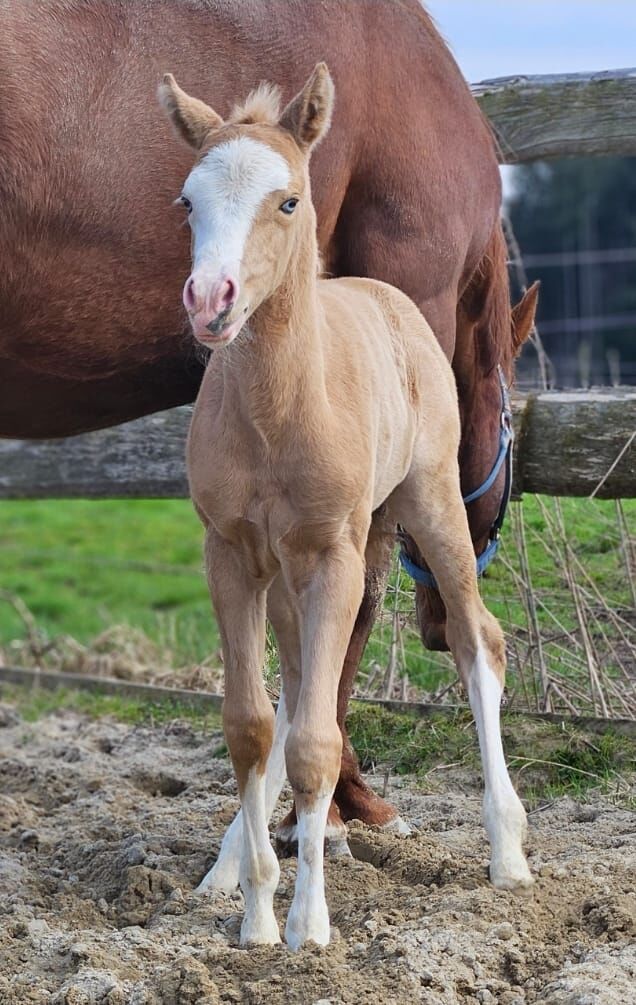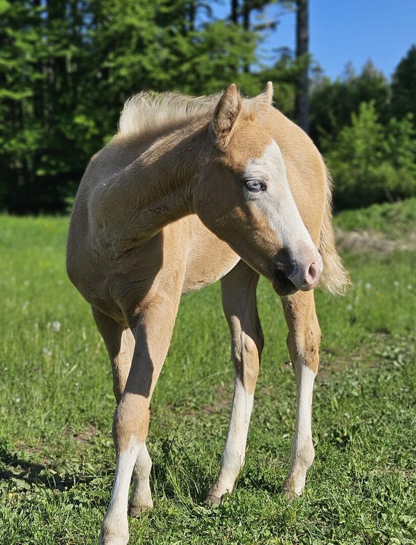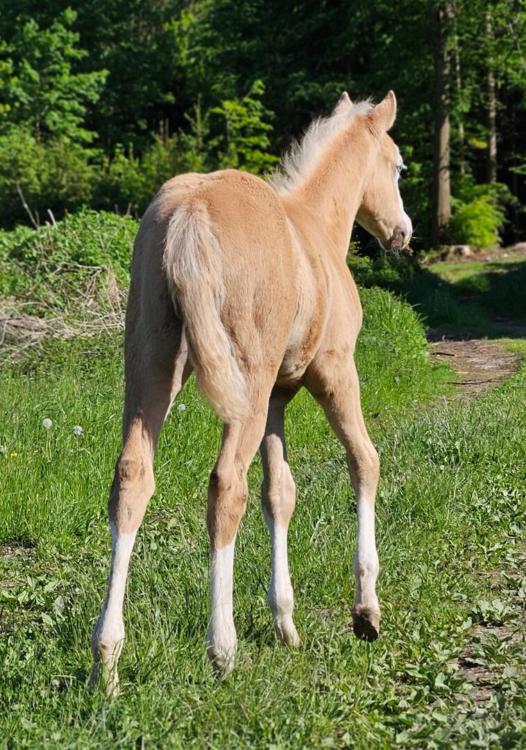 Absolut blickfång (Quarter Horse) - Plats: 83128 Halfing Wanda - en dröm på 4 ben. Quarter Horse-stoet, född 3.25 med en beräknad sluthöjd på 152 cm, förtrollar alla med sin look och sitt utseende. Hon har den underbara palomino-färgen med intressanta markeringar på huvudet. Wanda är ett mycket bra föl, med en korrekt, stark kroppsbyggnad och fina rörelser. Fölet är fortfarande lite reserverat, men tinar sakta upp och blir mer nyfiken. Hon är alltid vänlig och väluppfostrad. Senare vill hon bli en atlet och visar detta genom sitt livliga beteende. Fölet hanteras dagligen, känner hovslagaren och veterinären och fölet ABC när hon överlämnas. Senare kommer hon säkert att vara en bra partner i reiningklasserna, men på grund av sina goda rörelser är hon också intressant för ranchridning, ranch rail etc. Wandas stamtavla får varje reiningfantasts hjärta att slå snabbare: Spooks Gotta Gun, Shining Spark, Peponita, Topsail Flashy Jac. Hennes far är den framgångsrikt visade Spooks Grand Slam (LTE: 150.000 $). Hon kan stanna för avel om så önskas.