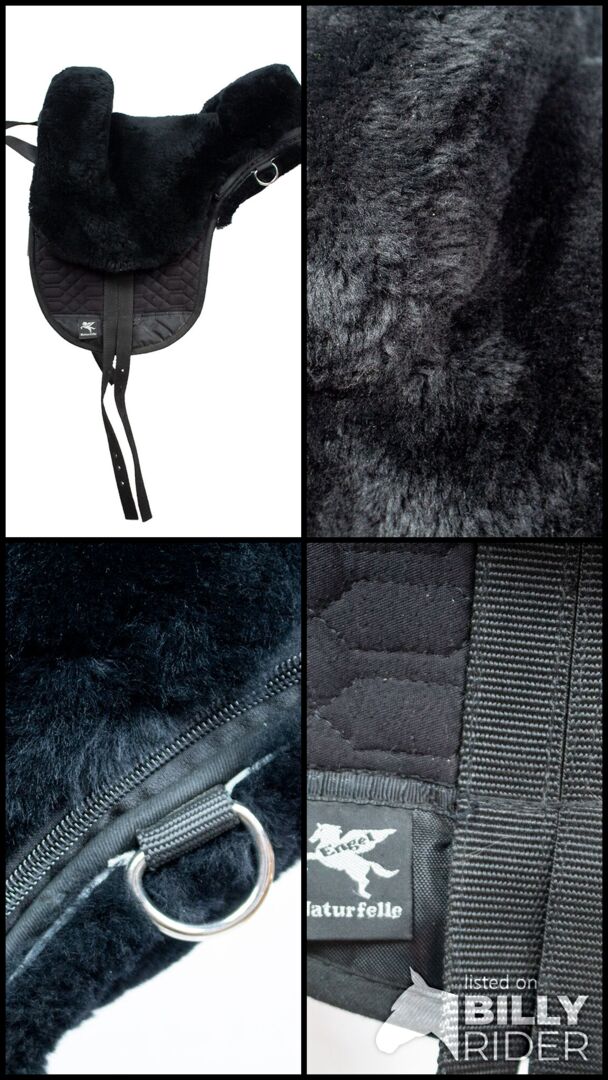 Ängelpälssadel med ponny av merino-lammskinn - Denna fantastiska sadel av hög kvalitet med merinolammskinn från Engel är i mycket gott skick. Den har bara varit på hästen några få gånger och är fortfarande som ny. Sadelns grundmaterial är quiltad bomull. Lammskinnet är fäst vid "basplattan" med två dragkedjor och kan därför tas bort. Detta gör det mycket lättare att rengöra. Den trädlösa sadeln med lammskinn i ryggen och sätet kan anpassas. Kuddarna i ryggen kan enkelt tas bort eller läggas till med kardborreband. De kan också bytas ut. Pälssadeln kan också fungera som en sadelmatta utan lammskinn. De stora sadelklaffarna och den höga sadelkanten ger optimalt stöd och komfort. Skinnsadeln kan också utrustas med sadelväskor eller stigbyglar. För detta ändamål har den D-ringar i vilka dessa kan fästas. Det går också att fästa hjälptyglar. Det finns också ringar för detta ändamål.