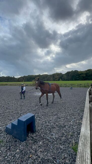 She’s good for the dentist and improving with the farrier, and recently spent a month with a professional trainer where she made great progress in her groundwork and general manners. She’s started hacking out more and is doing well — good with cars and traffic, though she can still be a little spooky or on alert at times.