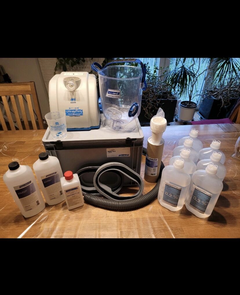 Air One inhalator med många tillbehör - Jag erbjuder min begagnade inhalator till försäljning. Den fungerar med el och är i perfekt skick. Som tillbehör finns det 2 fästen för masken ( 1x Pony + 1x Wb )