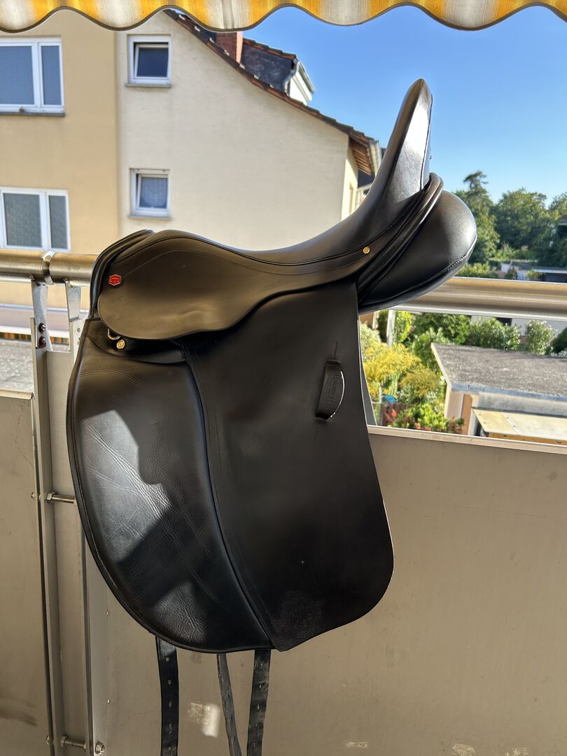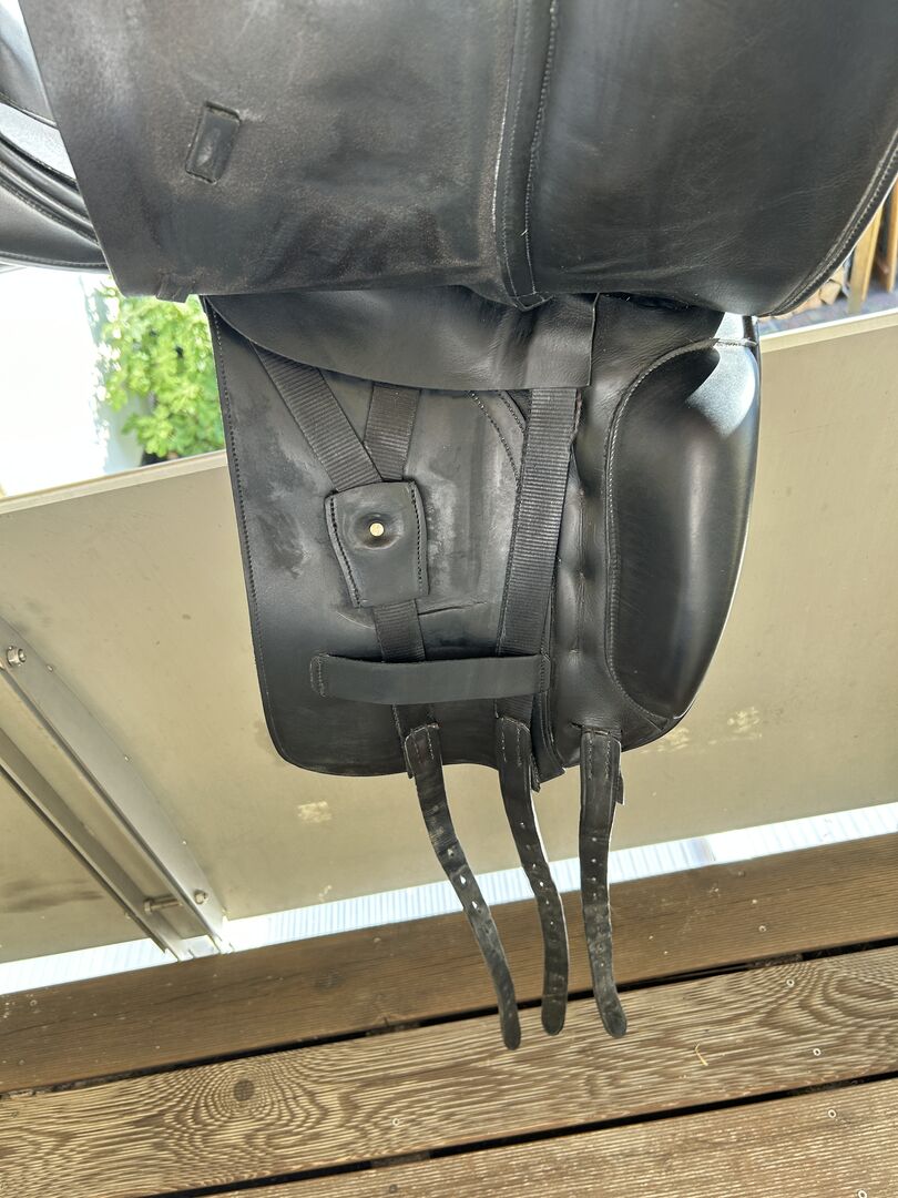 Albion SLK dressyrsadel - Jag säljer en mycket välskött Albion Europa SLK i 17,5 tum. Sadeln har HH (high head) gullet för hästar med mycket manke, den är även super lämplig för hästar med hög manke och rak rygg pga sin HH kammare och sin höga stoppning på bakpanelerna. Sadeln är från slutet av 2013 och begagnad, den har alltid varit mycket välskött och kan modifieras varmt av en sadelmakare. Sadelremmarna har några slitna hål men detta stör inte och du kan fortfarande göra om sadelgjorden normalt. Sadeln har 3 sadelgjordar och kan sadelgjutas i mitten och baktill så att det inte blir så mycket tryck på trapeziusmuskeln. Sadeln stoppades om helt i början av mars och nya filtinlägg sattes i så att det inte blir några knutar eller annat på sadeln, speciellt för hästar som är väldigt känsliga i ryggen. Sadeln har ett extra djupt säte som sitter väldigt nära hästens rygg.
