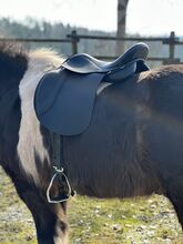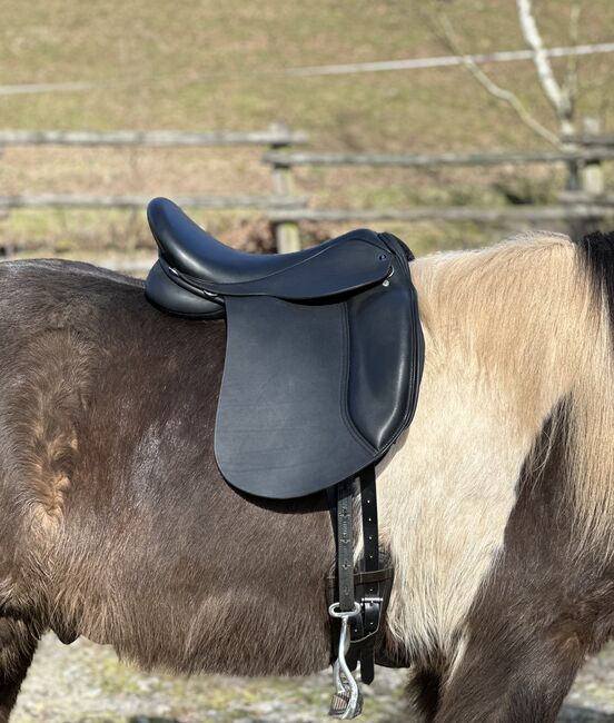 Allround sadel för fritid, dressyr & tölt - Provleverans - Isländsk Haflinger Tinker COB - Kort, bekväm allround-sadel för fritid/dressyr & tölt - passar runda hästar med låg mankhöjd, rak till lätt böjd rygg. 17" sits - skänkel ca 40 cm (total längd 43 cm) - KW 34 - bred ryggkanal (se foton för mått). Leverans efter godkännande (försäkrad med DHL-spårningsnummer).