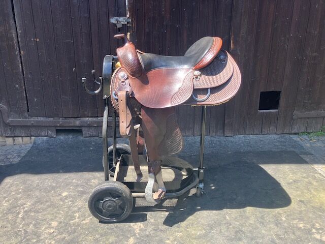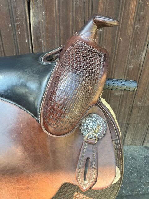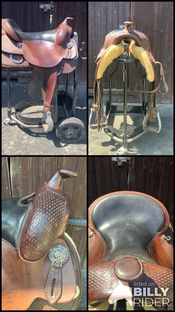 Allround western-sadel - Välbevarad allround westernsadel från LEO's Customer Made, färg brun med svart sits, stigbyglar i aluminium, lammskinn undertill, sitsstorlek ca 15,5 tum, total längd 64 cm, kammarbredd ca 16 cm till salu. Fler foton och mått på begäran. För ett förhandlat pris kan sadeln hämtas för montering.