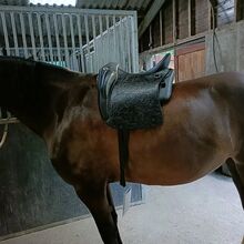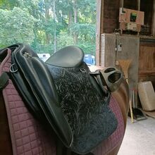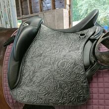 Fortfarande i mycket gott skick. 18 tum (passar även som 17,5 på grund av kuddarna) Vackert utförd med silverdetaljer. Används i ungefär ett år. Inc 2 dressyrgjordar 1 läder och 1 neopren från Iberosattel. Med sadelns passform och identifikationsnummer.