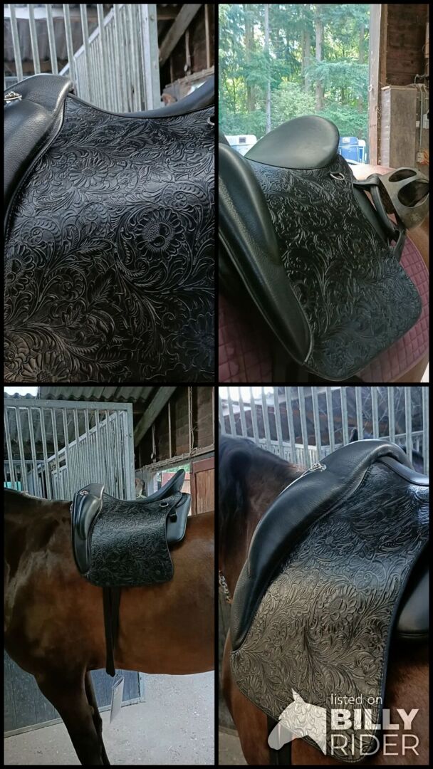 Fortfarande i mycket gott skick. 18 tum (passar även 17,5" sadlar på grund av stoppningen). Vackert utförd med silverfärgade detaljer. Används i ungefär ett år. Inklusive två Iberosattel dressyrgjordar: en i läder och en i neopren. Inklusive sadelpassform och identifikationsnummer.