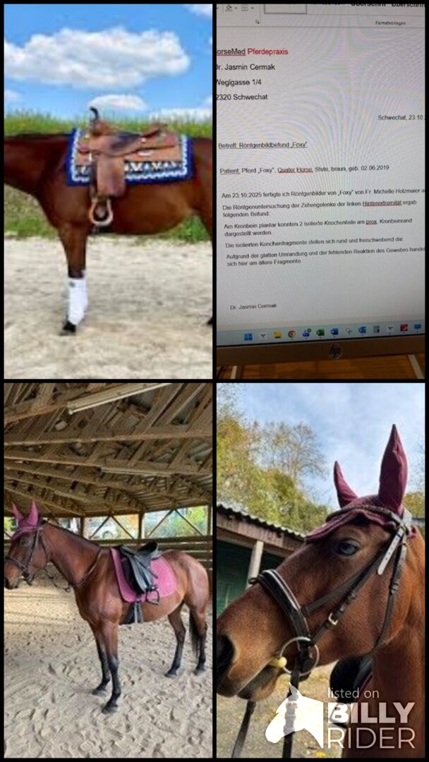 Vi söker ett nytt hem till vårt 6-åriga Quarter sto Foxy. Foxy kom till oss via en återförsäljare i slutet av september och var tänkt som en fritidspartner till min dotter. Efter en grundlig undersökning vid köpet visade det sig dock att hon hade en dubbel fraktur i kronbenet och två små bendelar var exponerade. Tyvärr ville återförsäljaren inte ta tillbaka stoet utan bara erbjuda ett byte - eftersom vi har tappat förtroendet vill vi nu själva hitta ett lämpligt hem åt Foxy.