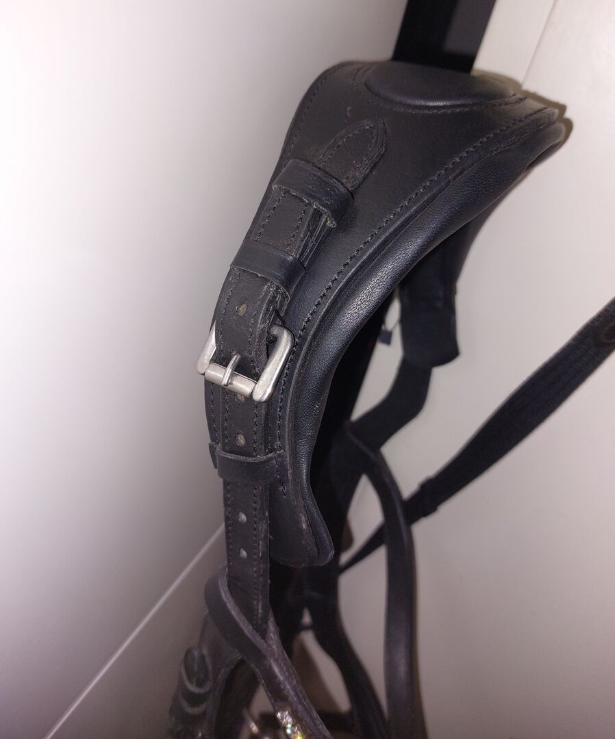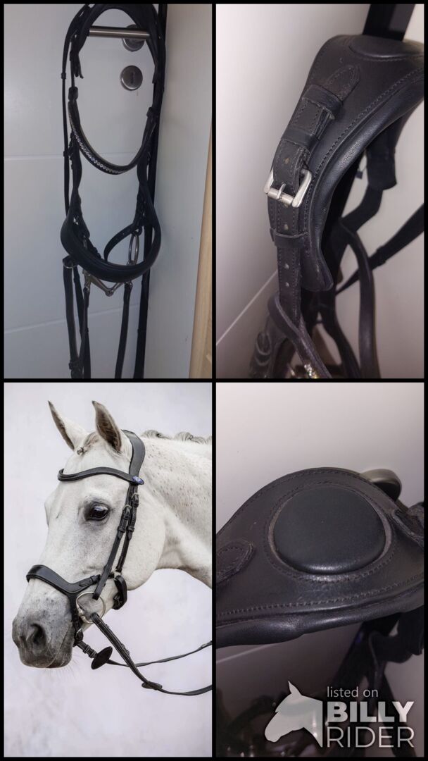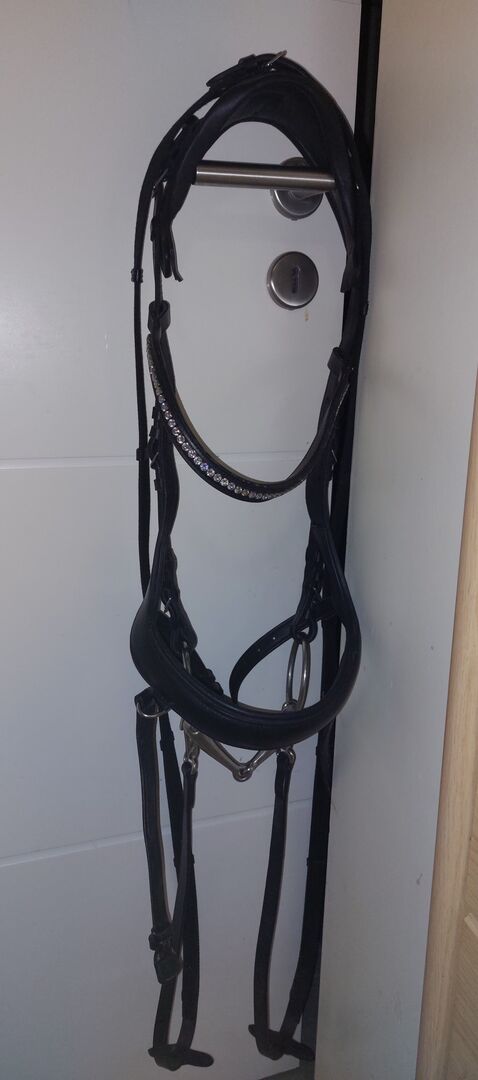 Anatomisk/Hanoversk träns av Felix Bühler i Full/WB - Jag erbjuder en svart anatomisk träns från Felix Bühler. Jag säljer den för att jag har sålt mitt sto. Mitt sto har bara haft det på sig en gång så det är som nytt. Tränset har en låsrem och ingen halssnara. Det har också ett brett och mjukt huvudstycke. Det nya priset på tränset var 99,90€, tyglarna 19,90€ och bettet 20,00€. Jag inkluderar också det enda trasiga bettet från Loesdau i 13.5. Tyglarna har tryckknappar som gör det mycket enkelt att ta av och på. På den tredje bilden är det inte detta träns, det ska bara visa hur tränset ser ut på hästen.
