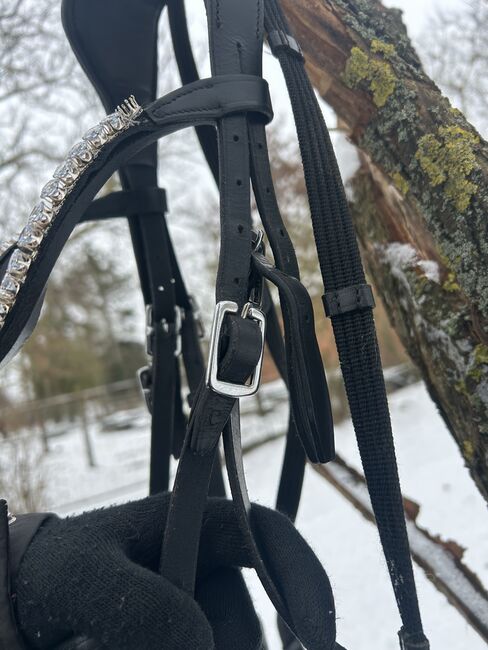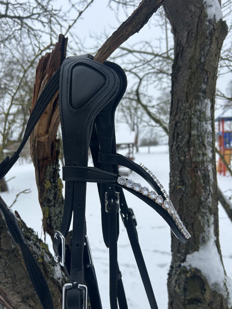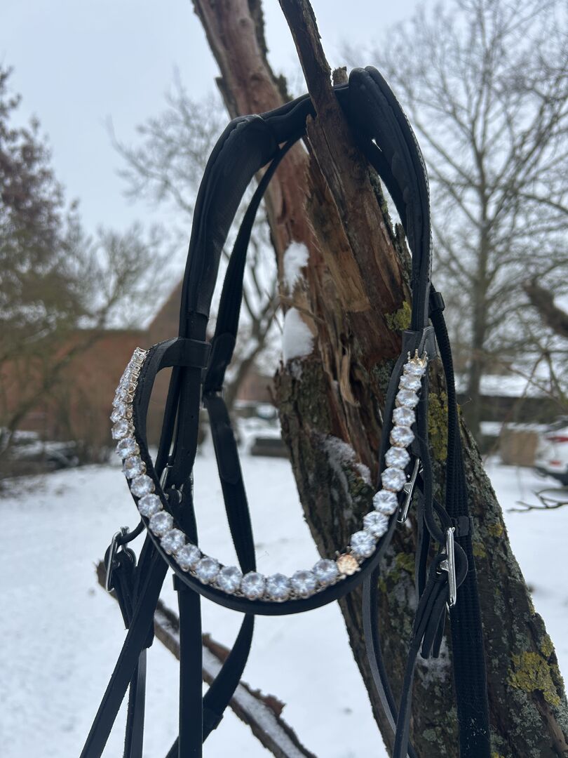 Tränset är tillverkat i svart konstläder och har följande egenskaper: - Storlek COB - lämplig för de flesta varmblod - Tyglar ingår - Bit kan köpas som tillval - Pannband med stendekoration -Anatomiskt huvudstycke