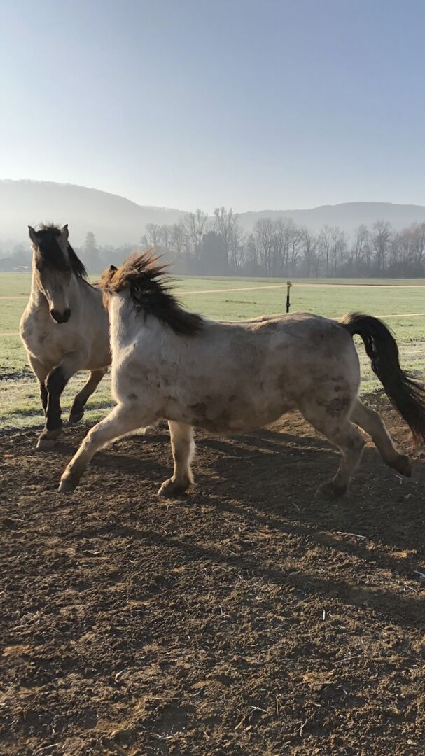Båda LBE-hästarna placerade i öppna stallar Uppstallning är endast möjlig med en mycket, mycket stor paddock.