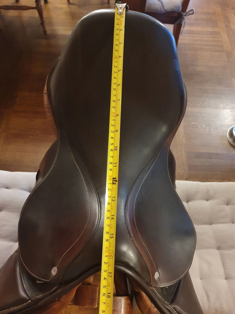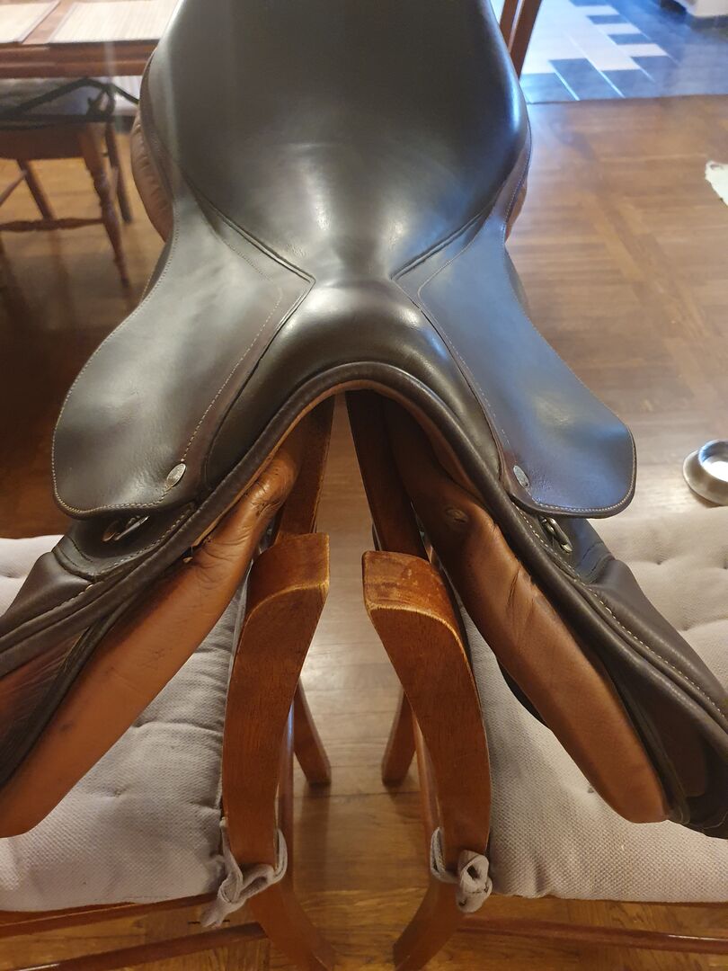 Antarès hoppande sadel 17,5" - Vacker Antarès hoppsadel med extremt mjukt kalvskinn. Regelbundet underhållen och oljad. Inga defekter. Sadeln ger ett utmärkt stöd vid hoppningen och är trevlig att sitta i.