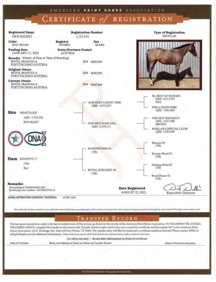 "Gigi" är för närvarande 1,63 meter lång. Hon har raka ben, kort rygg och ett harmoniskt helhetsintryck. Hon har bra rörelse och är mycket fin att hantera.