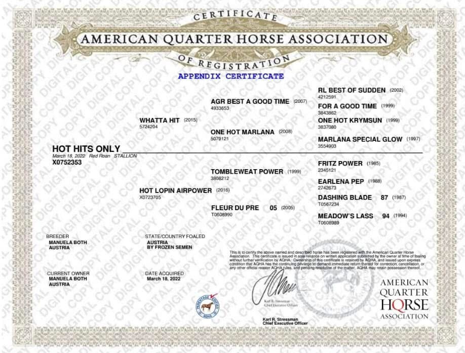 Vid leverans har han ett 6-paneltest, ett AQHA-papper, ett hästpass, är flisat, vaccinerat och avmaskat flera gånger! Han har en vit underläpp - möjligen skulle en dubbelregistrering vara möjlig.