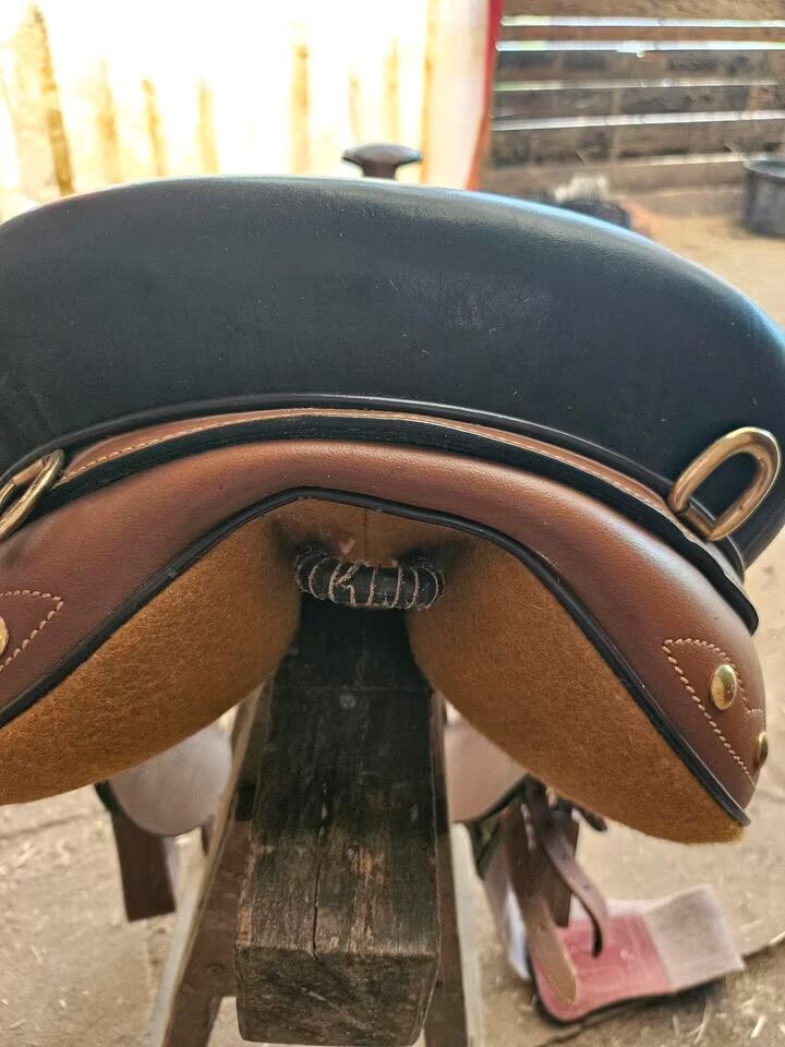 Australian stock saddle / resesadel / stock saddle - Till salu är den mycket bekväma stock sadeln inkl. 2 sadelgjordar och frakt i gott begagnat skick. Stoppningen är topp. Sadeln erbjuder mycket säkerhet under träning och i fält. Den monterades på en ung yngling med liten manke, men passar också smalare hästar med WR. Eftersom min häst har en kort rygg är denna sadel tyvärr inte längre lämplig för oss, se bilder för kontaktområde.