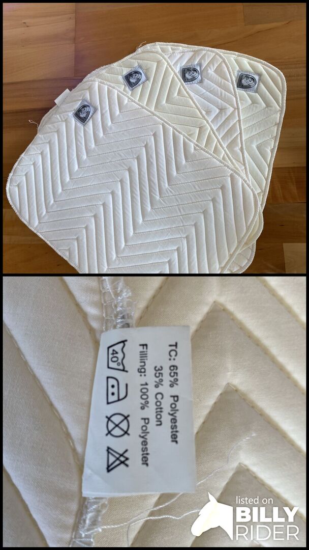 Bandageplattor - Vita bandageplattor. Har aldrig burits på en häst Yttermaterial 65 % polyester, 35 % bomull. Innerfoder 100 % polyester. Antal: 4 stycken, maskintvättbar vid 30 °C. Mått ca 40 x 30 cm.