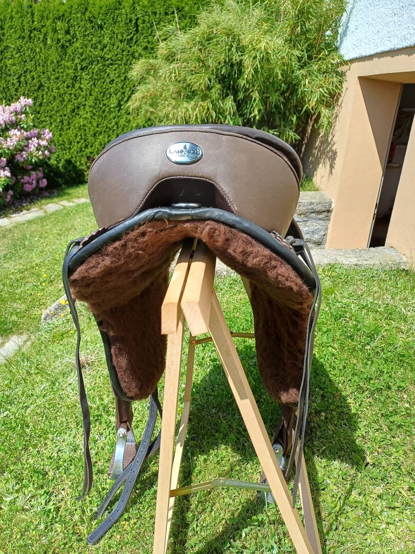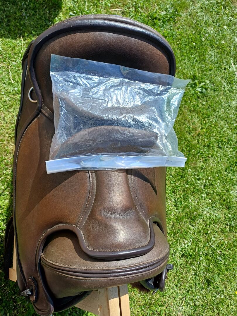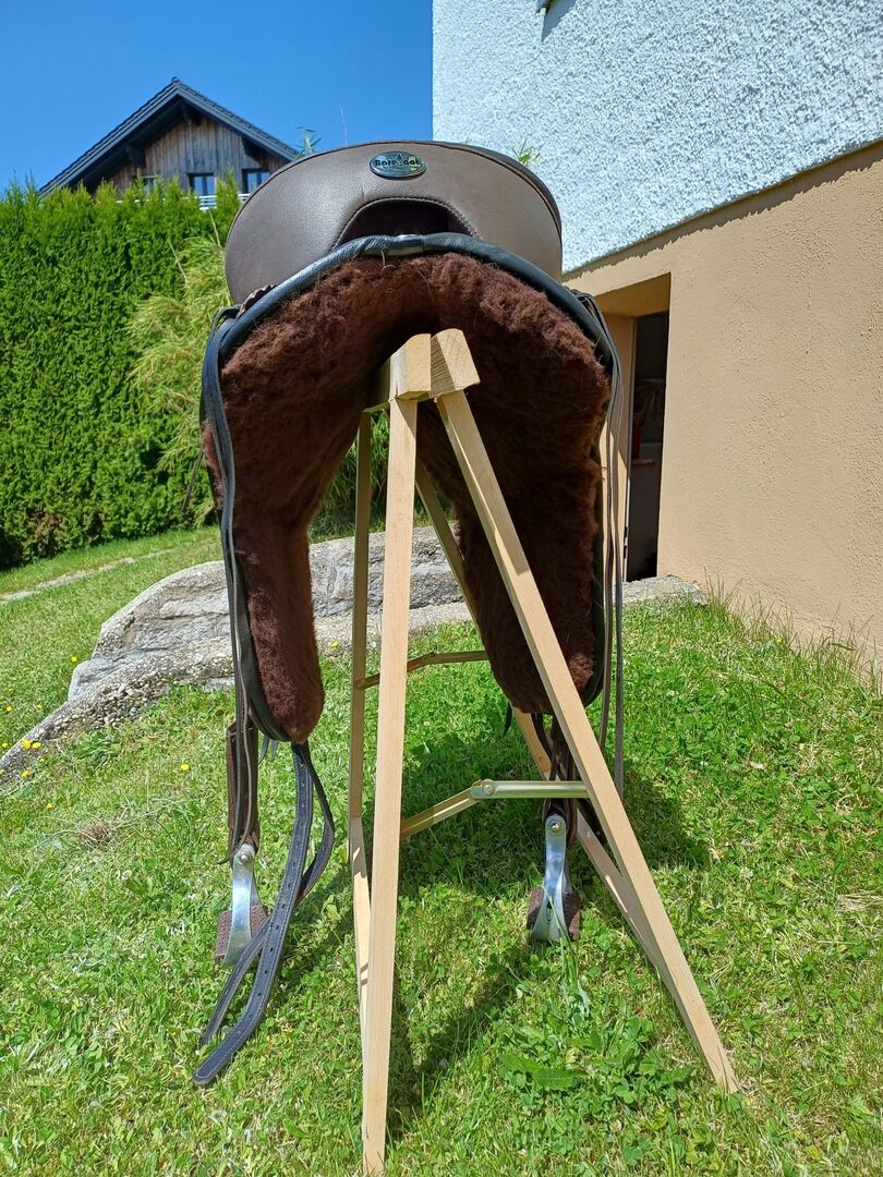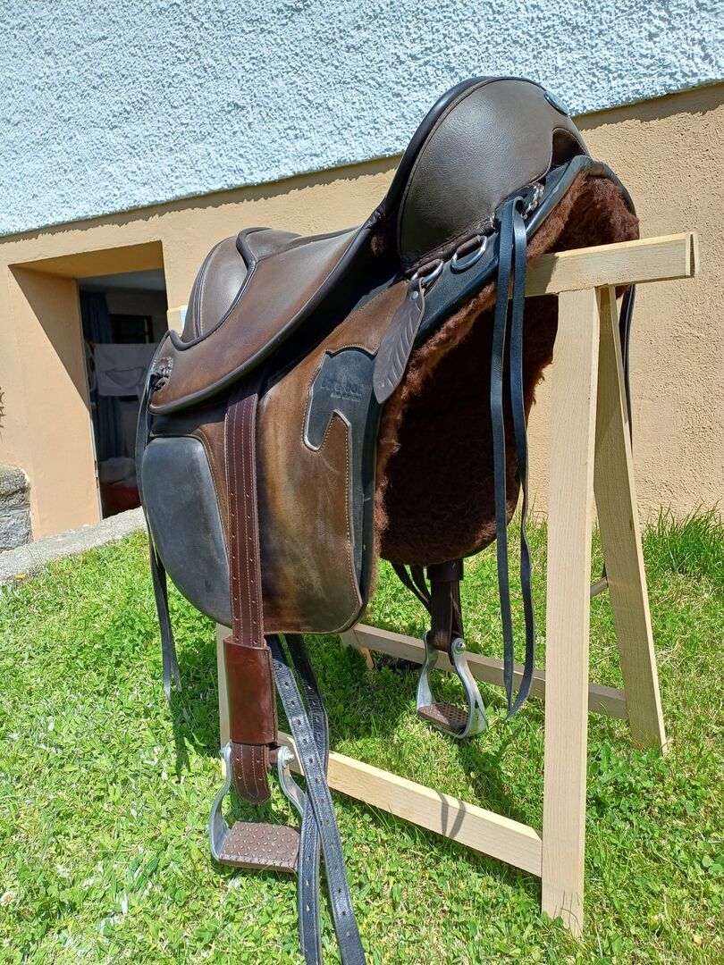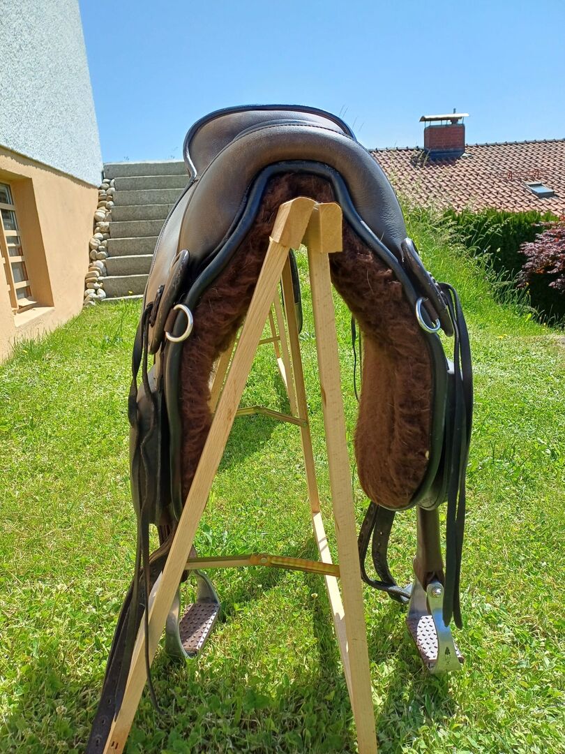 Till salu mångsidig, hästvänlig sadelmodell i mycket gott skick (knappast några tecken på användning, inga synliga grova märken) Beskrivning: - idealisk för terräng- och trailryttare - fritt positionerbar stigbygelupphängning (5 cm) - flexibelt V-gördel - tjock vävd päls på undersidan - vikt endast ca 6 kg - Färg: brun/svart med hästhuvud - Leveransen inkluderar sadelöverdrag och utbytbar pommel - Storlek: 1 motsvarar: Sadelns längd: 50 cm Sitsens längd: 35 cm sadelklaffens längd: 53 cm rekommenderas för damstorlek: 36-40