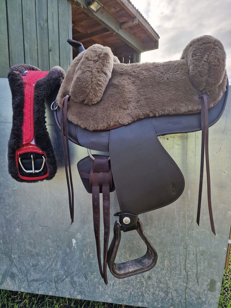 Gorgeous Lazy Mountain Saddle size 2 with a brown special pad, breastcollar , and a lovely 85cm contoured mattes cinch. Soft step stirrups and wide fenders. These have been used around 4 times so in great condition.