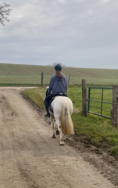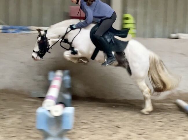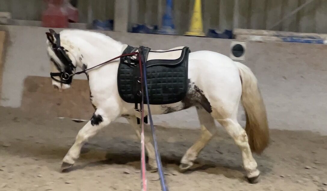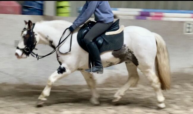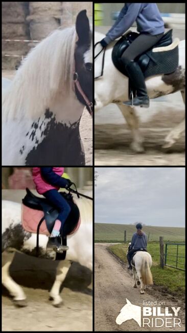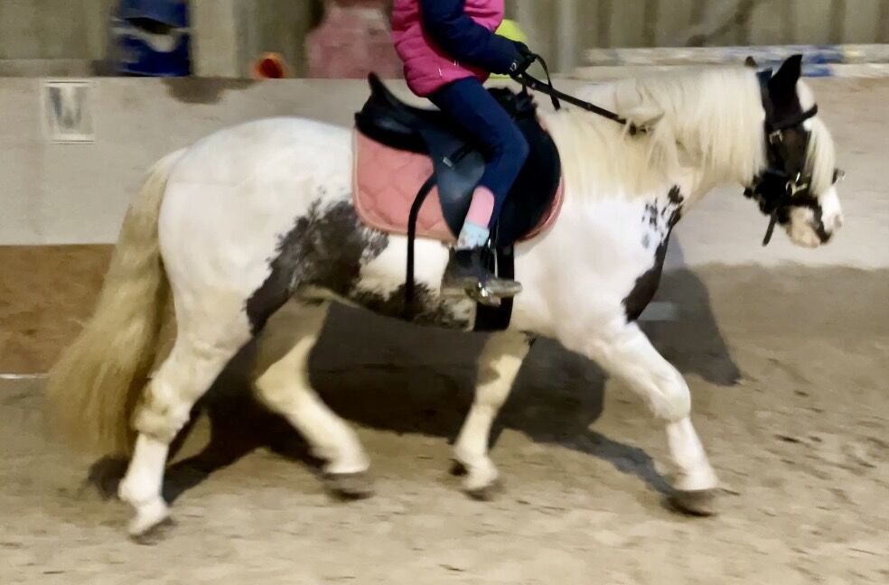 Barnkär Tinker cheque-sto (2017) - ponny för familj och fritid - Till salu är en 1,35 m lång Tinker chequer sto född 2017 med en absolut okomplicerad natur. Hon är barnvänlig, pålitlig och självsäker i terrängen - en dröm både under sadeln och i den dagliga hanteringen.