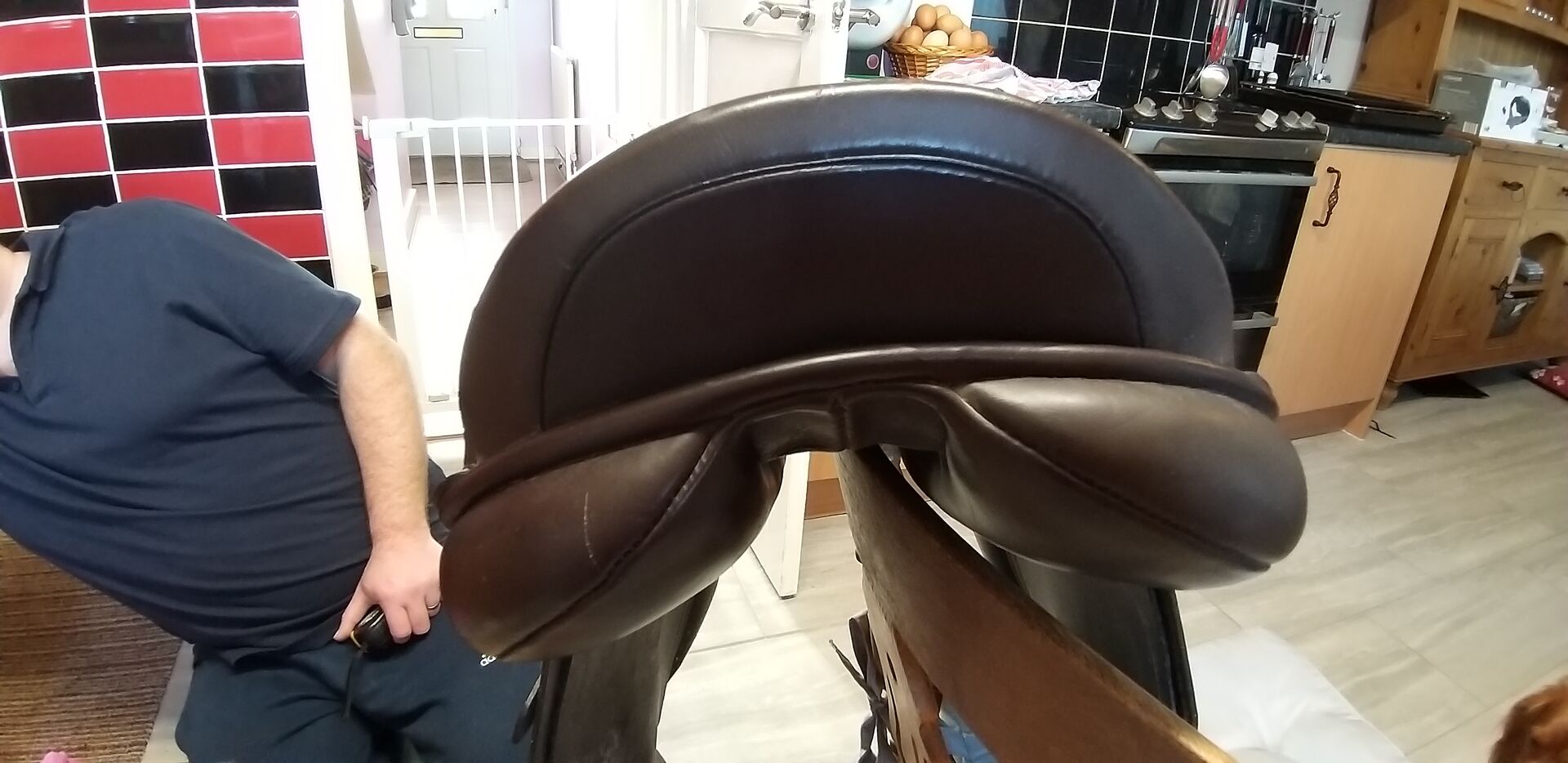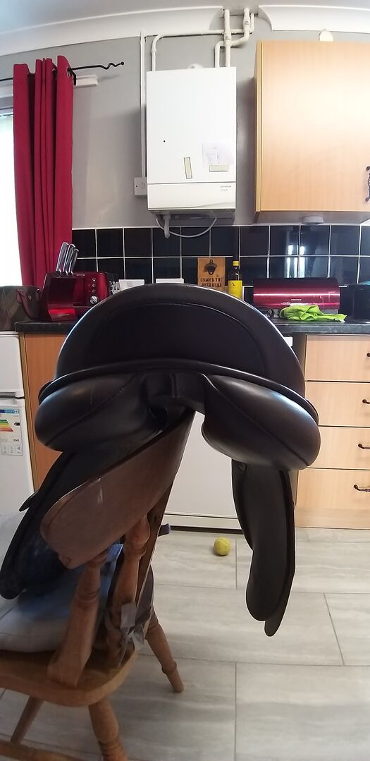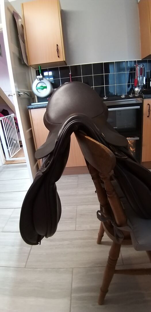 17.5 in brown cliff Barnsby saddle. Very little use and in good condition. Has a couple of scuffs please see pictures. Still plenty of life left in the saddle. I used it on my 15.3 hands medium build thoroughbred.
