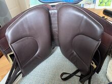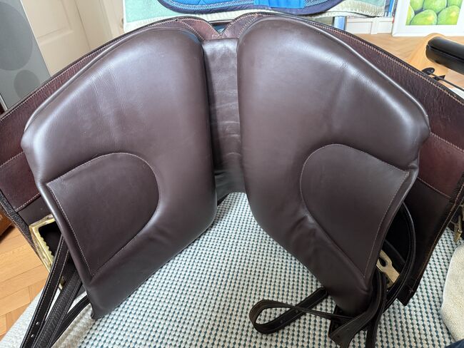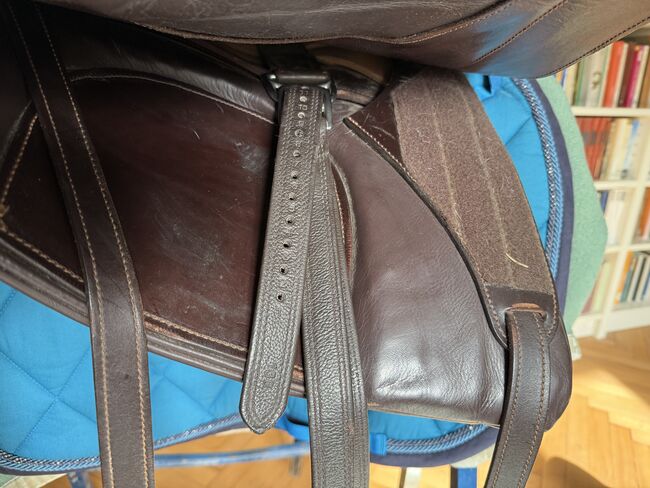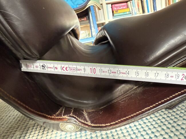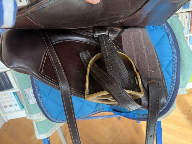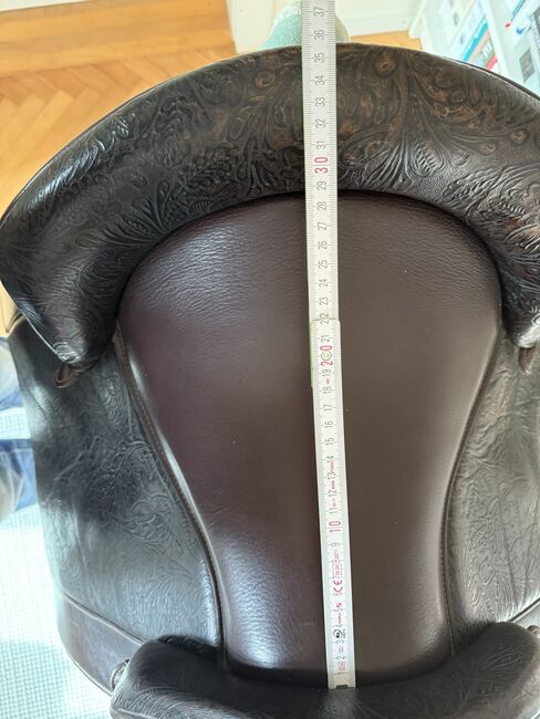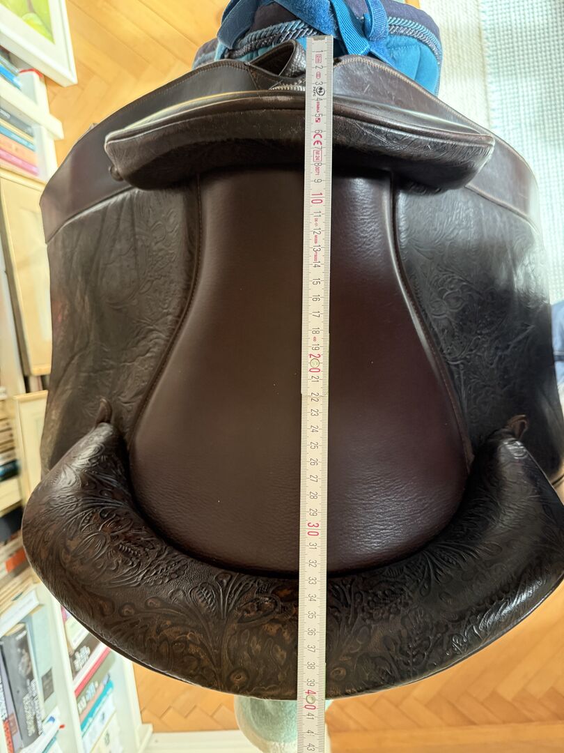 Barocksadel i läder av Reinhold Pecher, kort rygg, spansk - Mycket fin och superbekväm barocksadel El Noble med läderbom från sadeltillverkaren El Sueño av Reinhold Pecher. Sadeln är gjord för en kort spansk häst. Jag valde läderbygeln eftersom min häst fortfarande var ung och inte särskilt muskulös. Sadeln har praktiskt taget "vuxit" med hästen utan att behöva ändras, den reds i cirka 2 år eftersom det fanns en andra sadel tillgänglig, så sadeln har få tecken på användning och stoppningen är oklanderlig, se bilderna för måtten. Sätet är tillverkat av slitstarkt läder, sidopanelerna och galleriet är tillverkade av präglat vadderat läder, som hålls tunt för att vara närmare hästen. Kort sadelgjord och stigbyglar ingår. Nypris 3.800 euro. Faktura finns tillgänglig