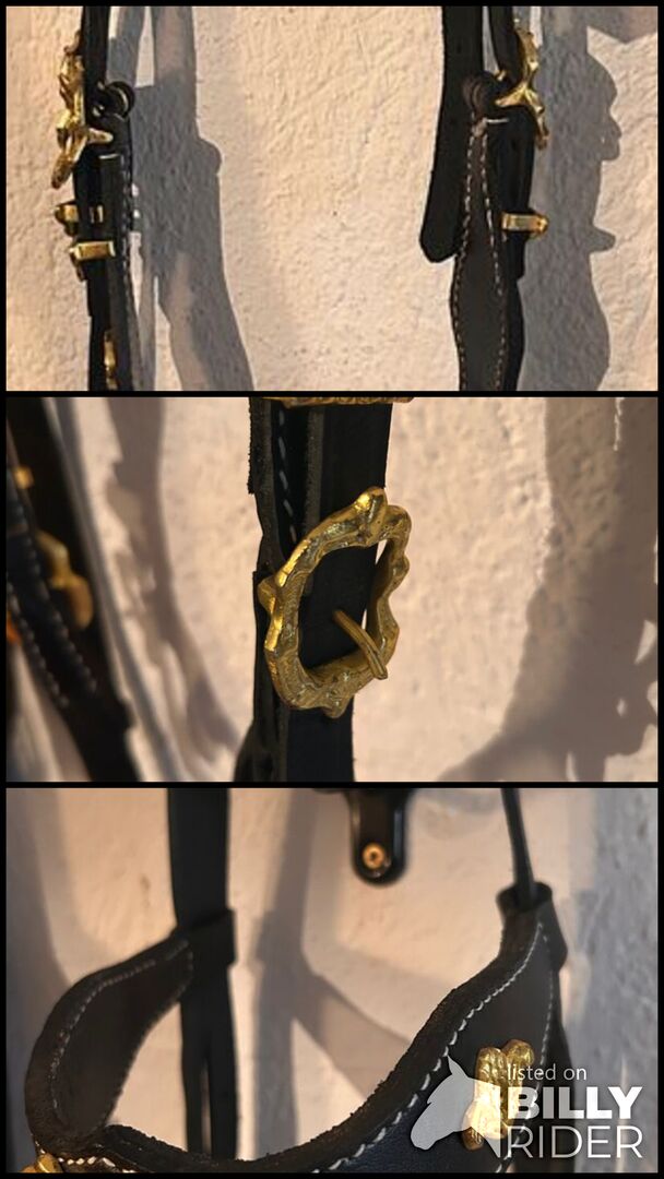 Barockt träns - Mycket vackert barockt träns tillverkat av mycket mjukt läder, svart, guld med vita dekorsömmar. Spännen i barockstil. 1 par tyglar ingår. För hästar med smala pannor (!) och långa huvuden.