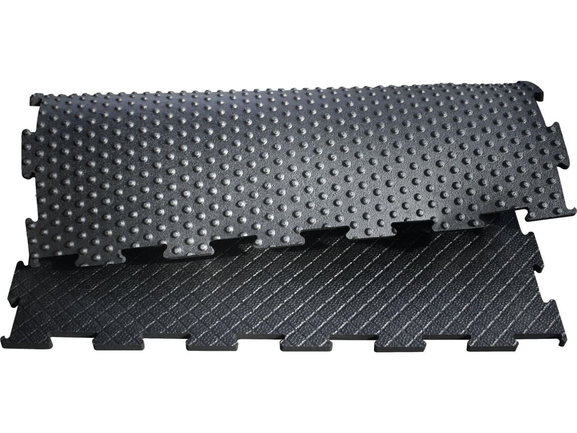 Yta: diamantprofil med slitageoptimerat toppskikt Undersida: Gropig profil Tjocklek: 24 mm Mått: 1 m × 1 m, pusselformad på 4 sidor