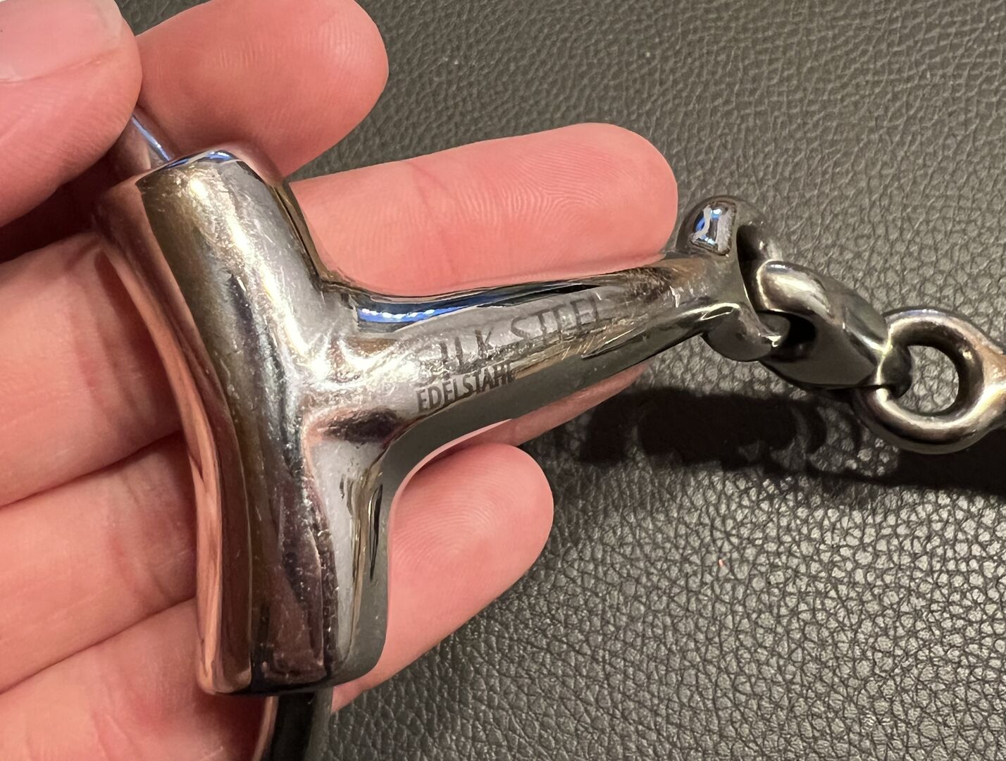 Bit, ring snäppa Silke Stål 14/14.5cm - Till salu här en begagnad men i mint skick ring snaffle bit. Storleken är 14,5 cm men enligt min åsikt och mätningar ser det mer ut som 14 cm. Bettet har bara några minimala repor. Jag köpte det själv begagnat som ett 15,5 cm bett, men det är ingen fantasi att det verkligen är det. Jag har inte använt den. Beskrivning från Krämer: Kombinerar fördelarna med vattentränset (ökad tuggaktivitet på grund av de fritt löpande ringarna) med fördelarna med olivhuvudtränset (mindre risk för att dra igenom och skydd av munhörnen). Rostfritt stål, solid. Tjocklek 15 mm. Bett i rostfritt stål är mycket populära på grund av sin smidighet och hållbarhet. De är också lätta att rengöra och underhålla.