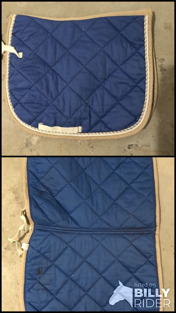 Blått dressyrschabrak med beige kant FULL - Blått schabrak med snodd och beige kant. Jag har använt det till både hoppning och dressyr, även om det inte är den typiska storleken på ett dressyrschabrak.