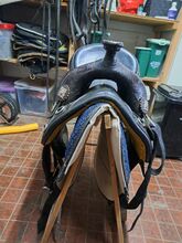 Bob Marshall sadel - 16-tums Boomless-sadel med blomstersmyckning. Rund kjol i mörkbrunt läder. Saknar 1 concho. Har vissa tecken på användning.