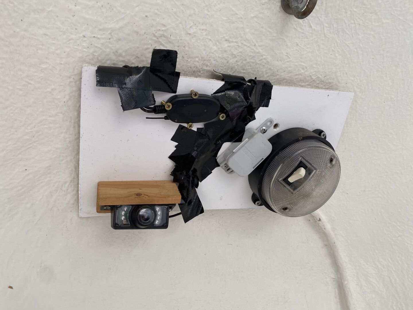 Kameran i trailern är en backkamera (se bild), som fungerar bra och kan ges bort, den är ansluten i bilen via cigarettändaren. Spegeln framtill sitter också kvar på släpet och är mycket praktisk för att koppla på.